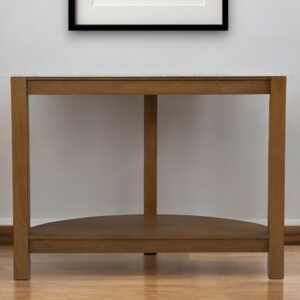 42″ White and Natural Faux Marble Half Circle Three Leg Console Table With Shelves