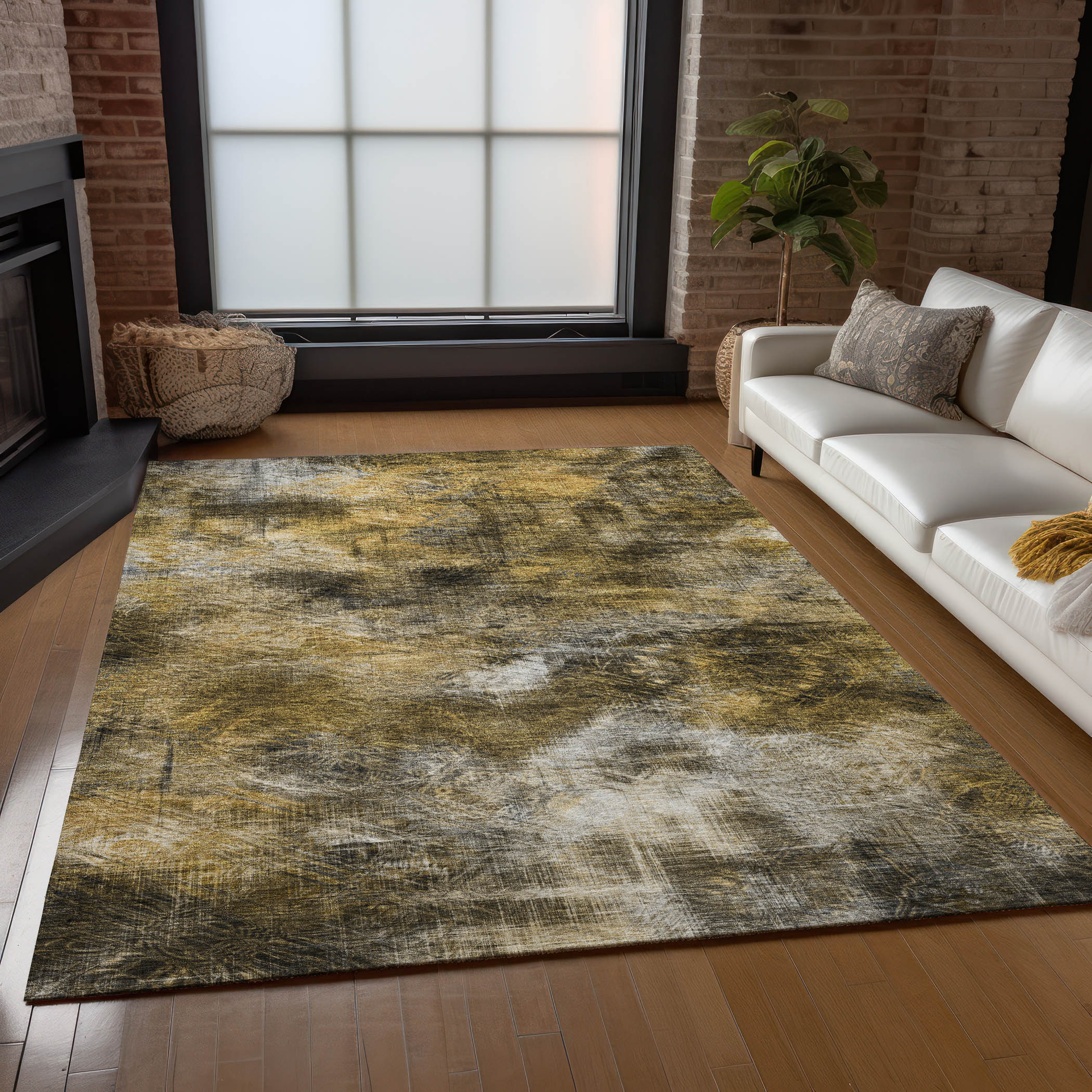 This 10-foot x 14-foot brown beige and gold abstract washable indoor outdoor area rug, is a great way to add warmth to a room. This rectangle shaped rug features a abstract design that will work well both indoors or out. A classic shape marries with good looking design for your living room, hall, bedroom, porch, patio, or poolside. Ideal for outdoor spaces or high traffic areas with kids and pets, this rug is made from heavy duty polyester that is stain resistant to help repel water, dirt, and stains. Makes a great way to dress up your patio, porch, or poolside, but also works well as a durable and easy to maintain option in the kitchen, family room, or mudroom. 120-inch h x 168-inch w x 0.19-inch d.