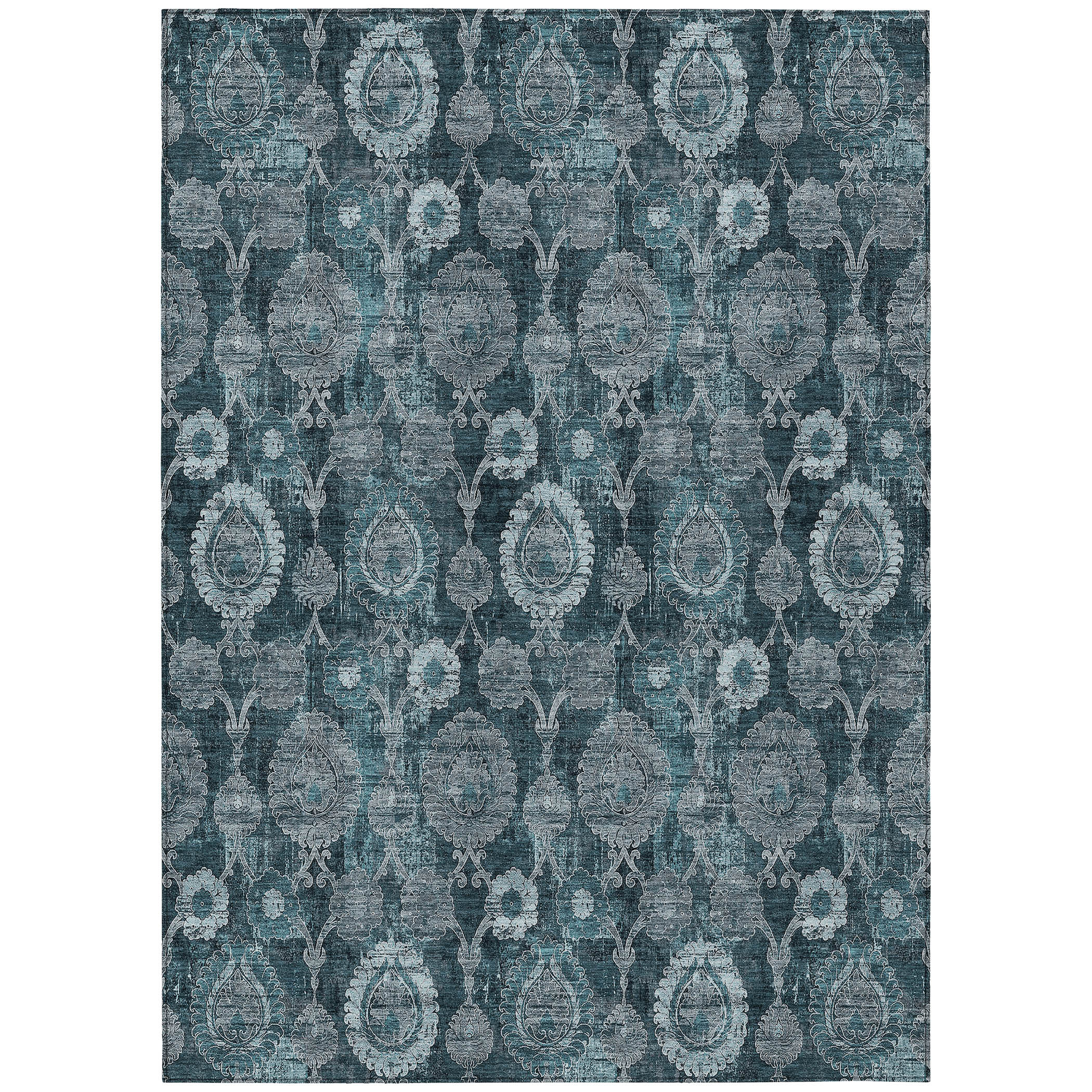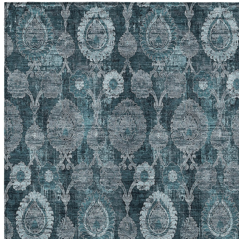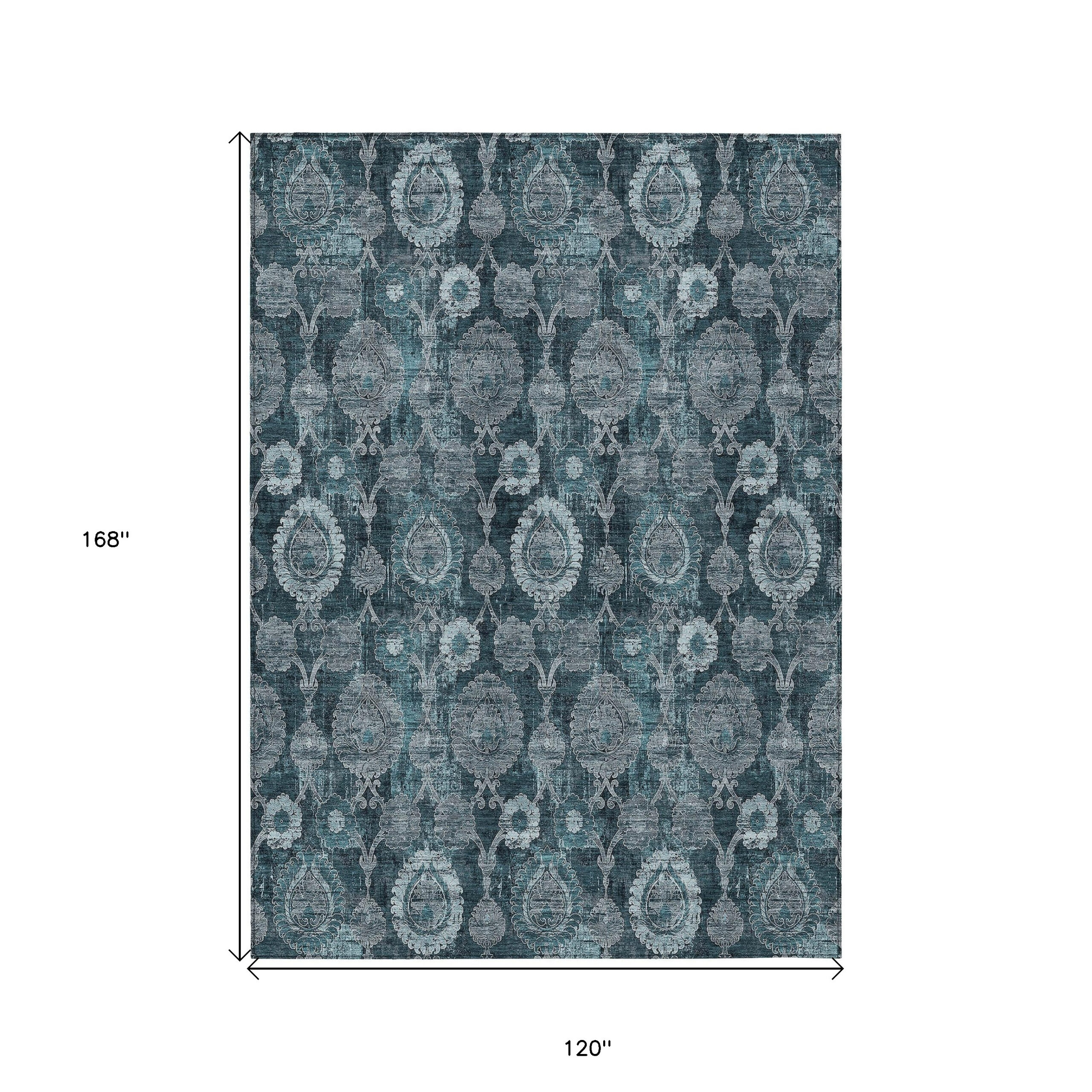 10′ X 14′ Teal Blue And Sky Blue Damask Washable Indoor Outdoor Area Rug