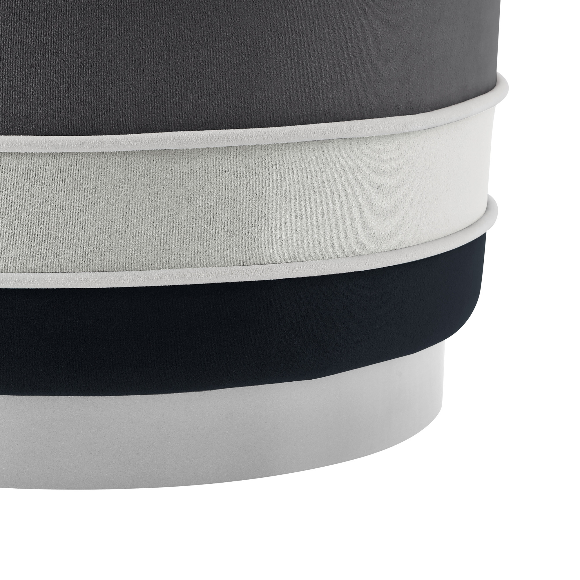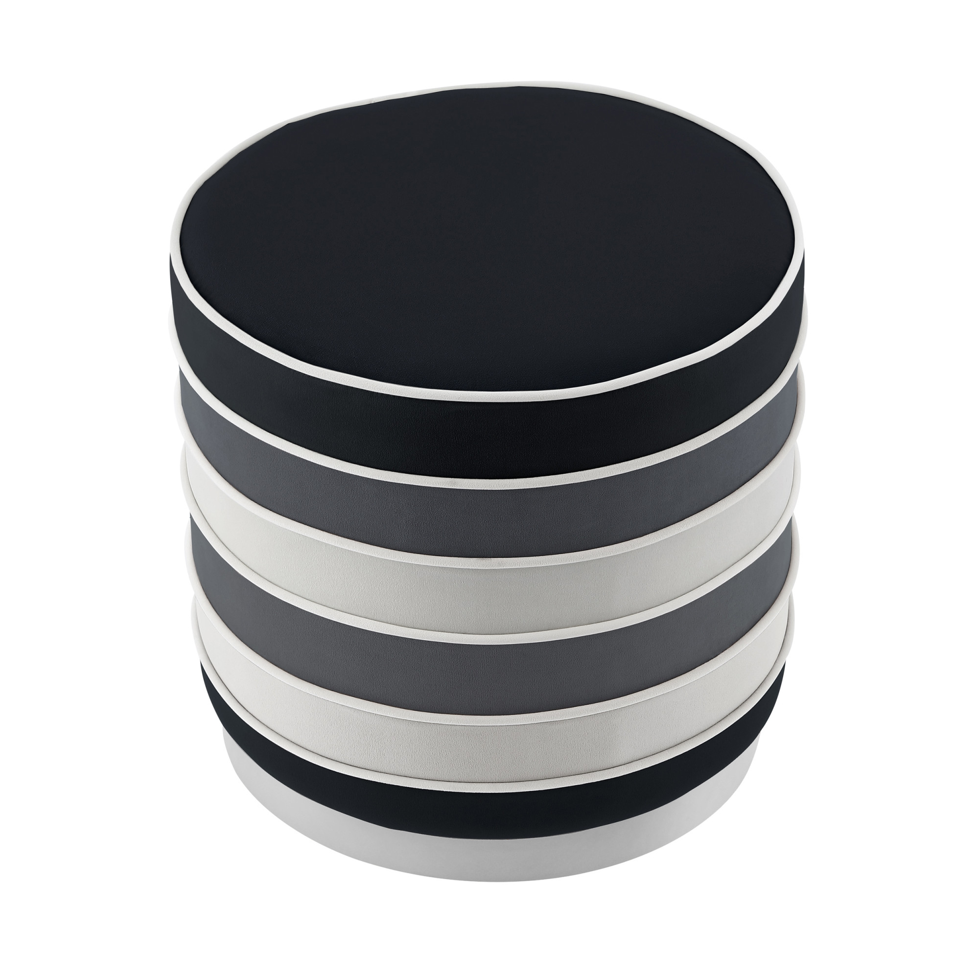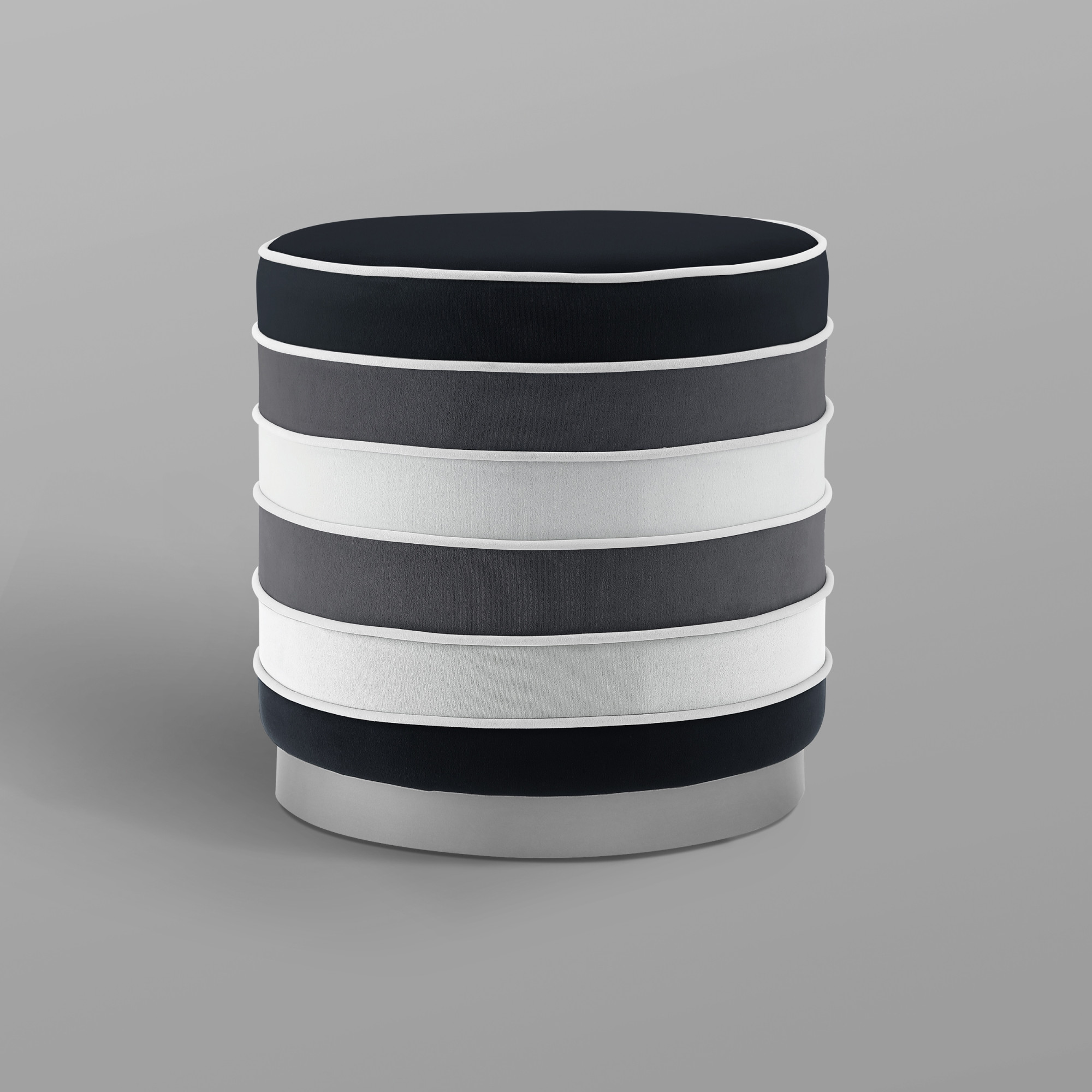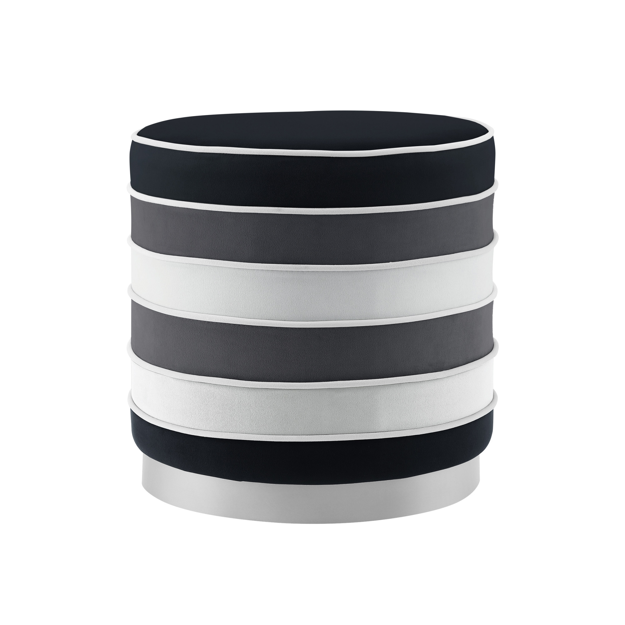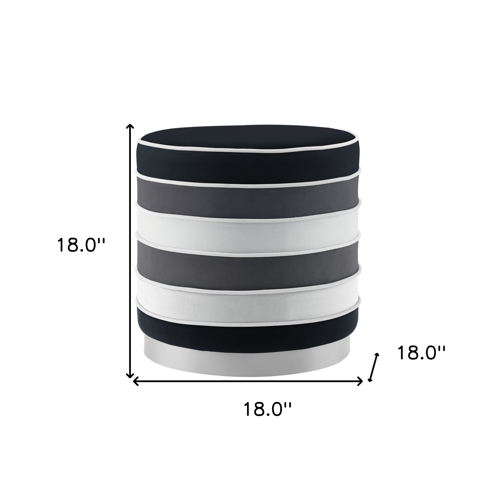 18″ Black Velvet And Silver Round Striped Ottoman