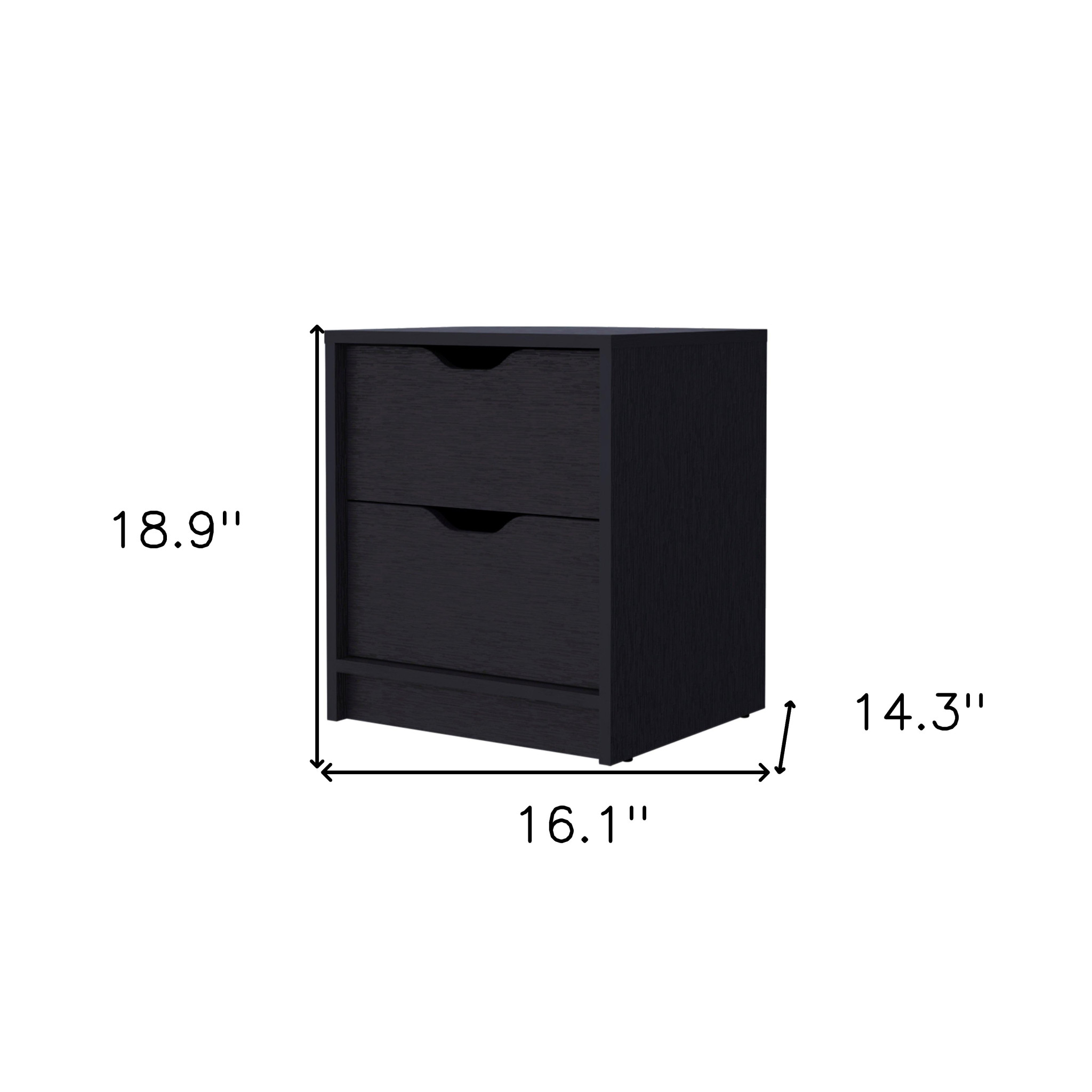 Good looking design and practical styling meet to form this 19-inch black two drawer nightstand with integrated tech. Robust in design, the bed side table has been expertly crafted from manufactured wood. The piece has 2 drawers to store your bedtime essentials close to you as you rest. Includes integrated technology to keep you charged and connected. The unsung hero of the bedroom, this nightstand is perfect for keeping a glass of water, lamp, alarm clock, jewelry, and more, close by and easily accessible. Look no further than this nightstand to accommodate all your needs and upgrade the style of your bedroom. 18.9-inch H x 16.1-inch W x 14.3-inch D