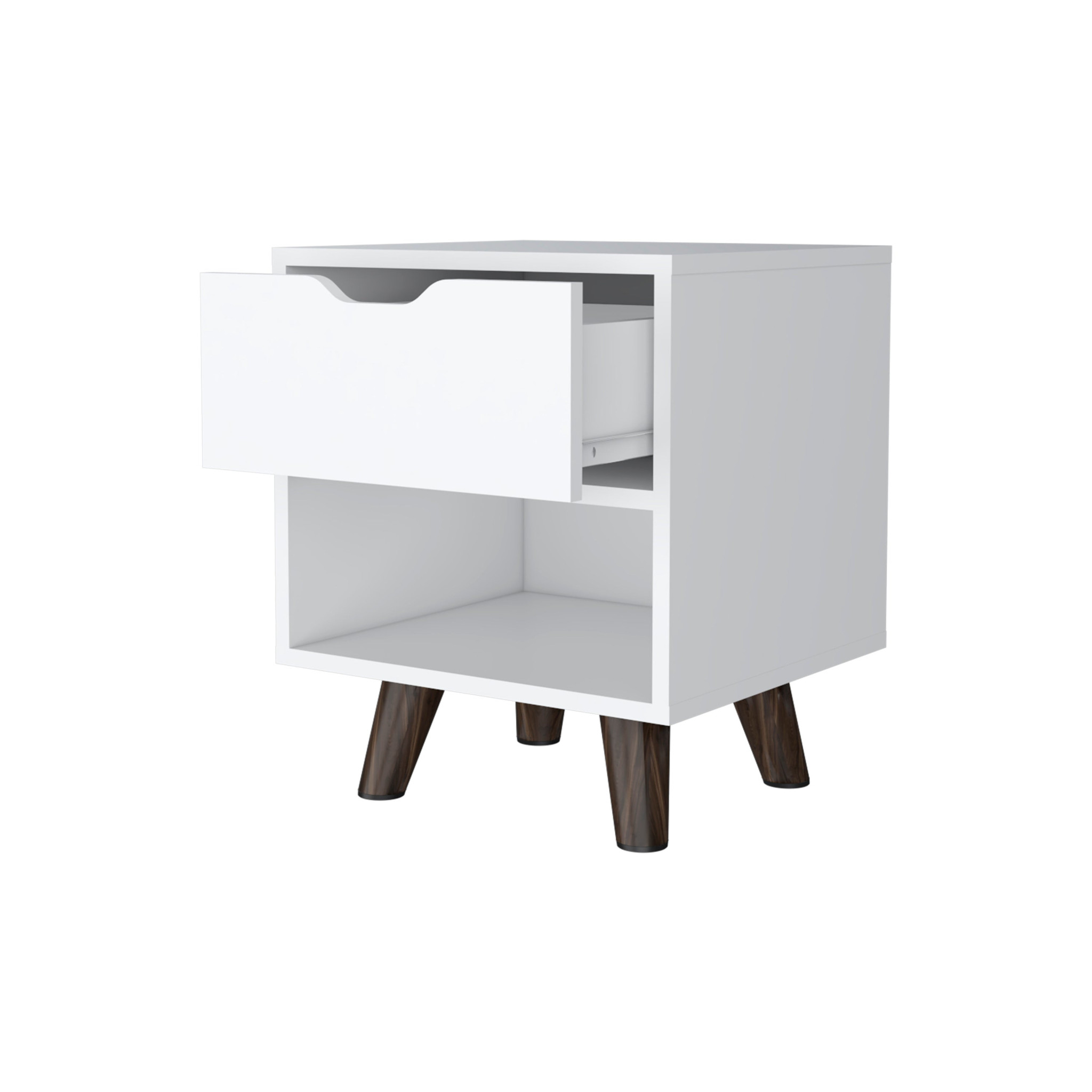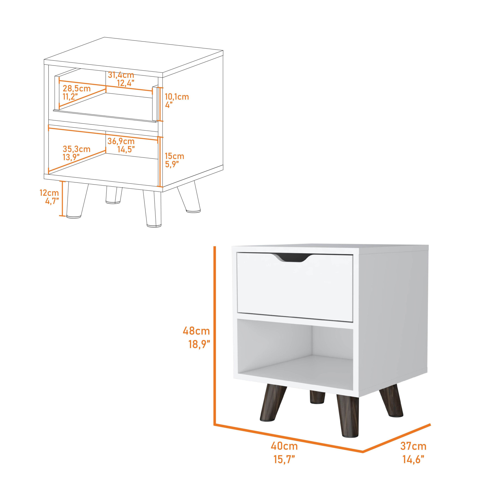 Good looking design and practical styling meet to form this 19-inch white one drawer faux wood nightstand. Robust in design, the bed side table has been expertly crafted from manufactured wood. Includes a drawer to help keep your essentials close by and hidden. An easy-access shelf gives you additional storage and display space. The unsung hero of the bedroom, this nightstand is perfect for keeping a glass of water, lamp, alarm clock, jewelry, and more, close by and easily accessible. Nightstands are obviously great beside the bed but can be used just as easily to help battle clutter in your living room, hallway, office, or dining room. 18.89-inch H x 15.74-inch W x 14.56-inch D
