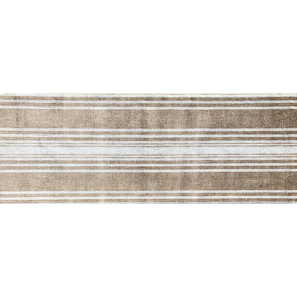 This low profile Sandy Shores Regatta Stripe Washable Floor Mat Runner is a game changer. A fade resistant slightly distressed varigated regatta stripe design in multi shades of sandy tan, ivory and white that is a fashion forward look for a mat that is super sturdy and can easily be thrown into the washer and dryer to clean. The premier formula rubber backing used makes this nylon rug slip resistantr with no need for an additional pad, and the backing will hold up during the wash and dry! The low profile means it easily fits under doors. Combine fashion and style with real life functionality with this great area rug/door mat. 27.5″ x 75″ x .3″