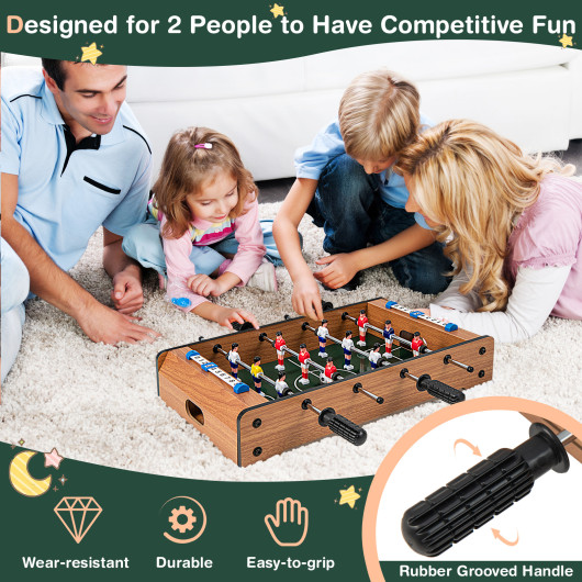 - Fun for Kids & Adults: This mini foosball table is great for kids (aged 6 +) and adults to get lots of enjoyment. What’s more the foosball table not only allows kids to relax in spare time and gives a chance to play interactive games with friends and families but also improves their hand-eye coordination.