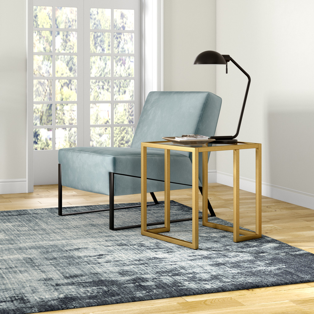 Distinctive in style the 22-inch brass and clear glass and steel square end table radiates a versatile charm. The clear glass top of this table is a nice contrast to the high quality, brass steel of the base. An ideal location for placing your snacks and drinks, and a place to keep your lamp, frames, or other accessories. You can match it with other pieces to get the ideal look for your place. 22-inch H x 20-inch W x 20-inch D