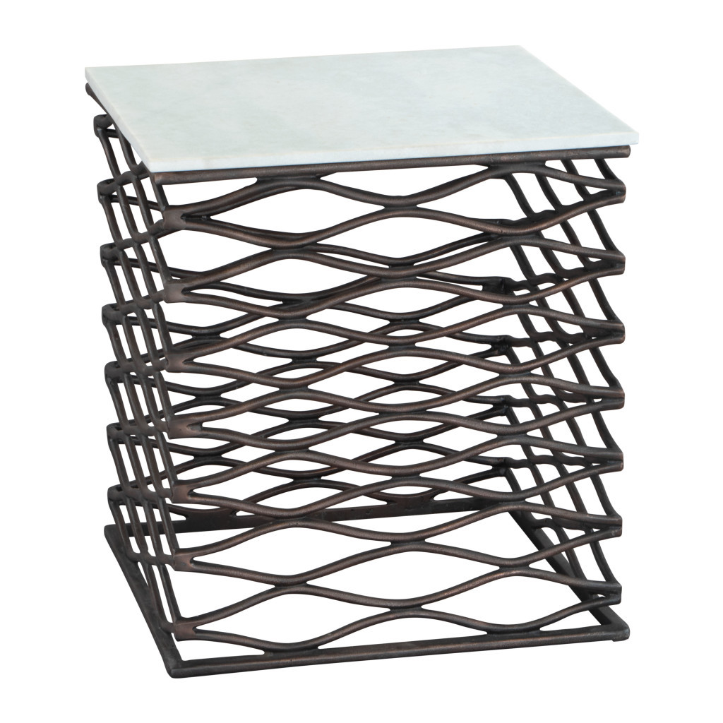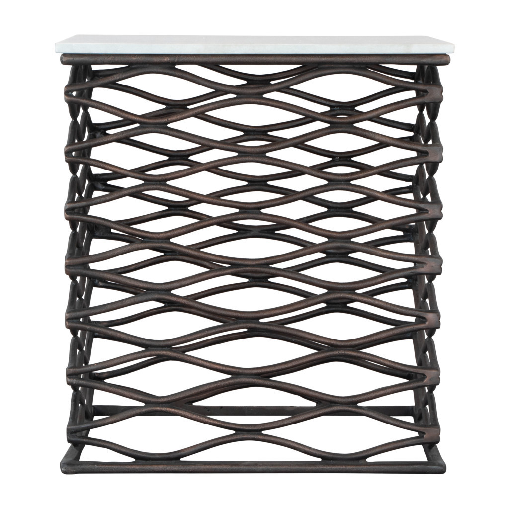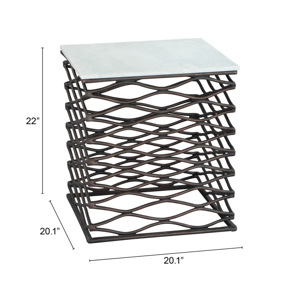 Show off your exquisite taste with this 22-inch white and bronze marble and aluminum square frame end table. The base of this table is made from aluminum in a bronze color that is a nice contrast to the white marble tabletop. Side tables are a great way to flank your sofa, use as an accent next to your favorite chair, or can even be used bedside. You can match it with other pieces to get the ideal look for your place. 22-inch h x 21-inch w x 21-inch d.