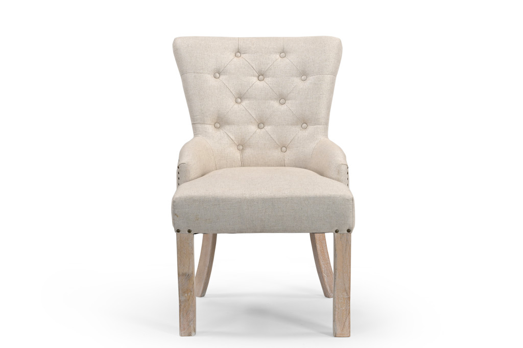 Stylish, elegant and fully functional, the 24-inch beige fabric tufted arm chair adds a touch of panache to any set up. This sturdy fabric upholstered arm chair comes in a chic solid beige color to give your space just the right look. Giving the chair stability and structure, the inner frame is constructed with high quality solid wood, includes comfy armrests, and features a fixed back that comes complete with soft and comfortable cushioning. The tufted cushions add fine designer detailing. Nailhead trim gives this chair a refined look that adds additional texture and visual interest. 35.5-inch h x 23.5-inch w x 27-inch d.