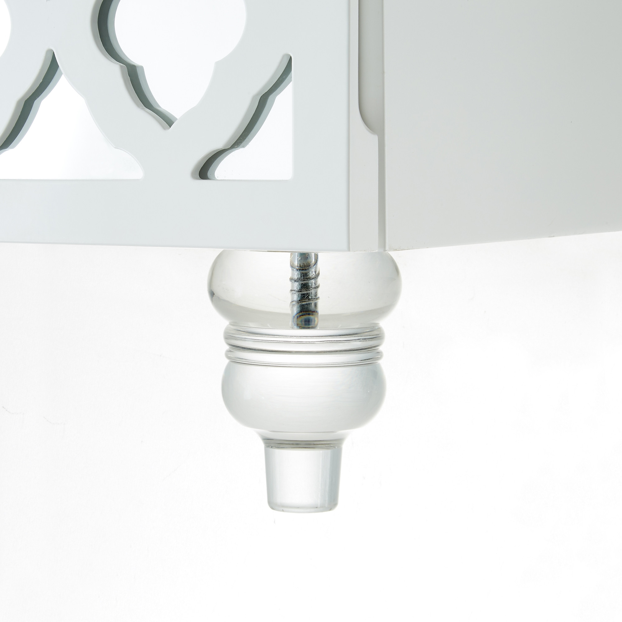 Distinctive in style the 24-inch clear and white mirrored end table with three drawers radiates a versatile charm. Offering a nice color combination, the top of this manufactured wood table is white, while the base compliments it nicely in clear. Reflective pieces of mirrored glass give this table a glamorous and unique look. Includes 3 easy open drawers for storage of the small essentials. Side tables are a great way to flank your sofa, use as an accent next to your favorite chair, or can even be used bedside. You can also use it as an entryway table to hold your keys. 24-inch H x 24-inch W x 18-inch D