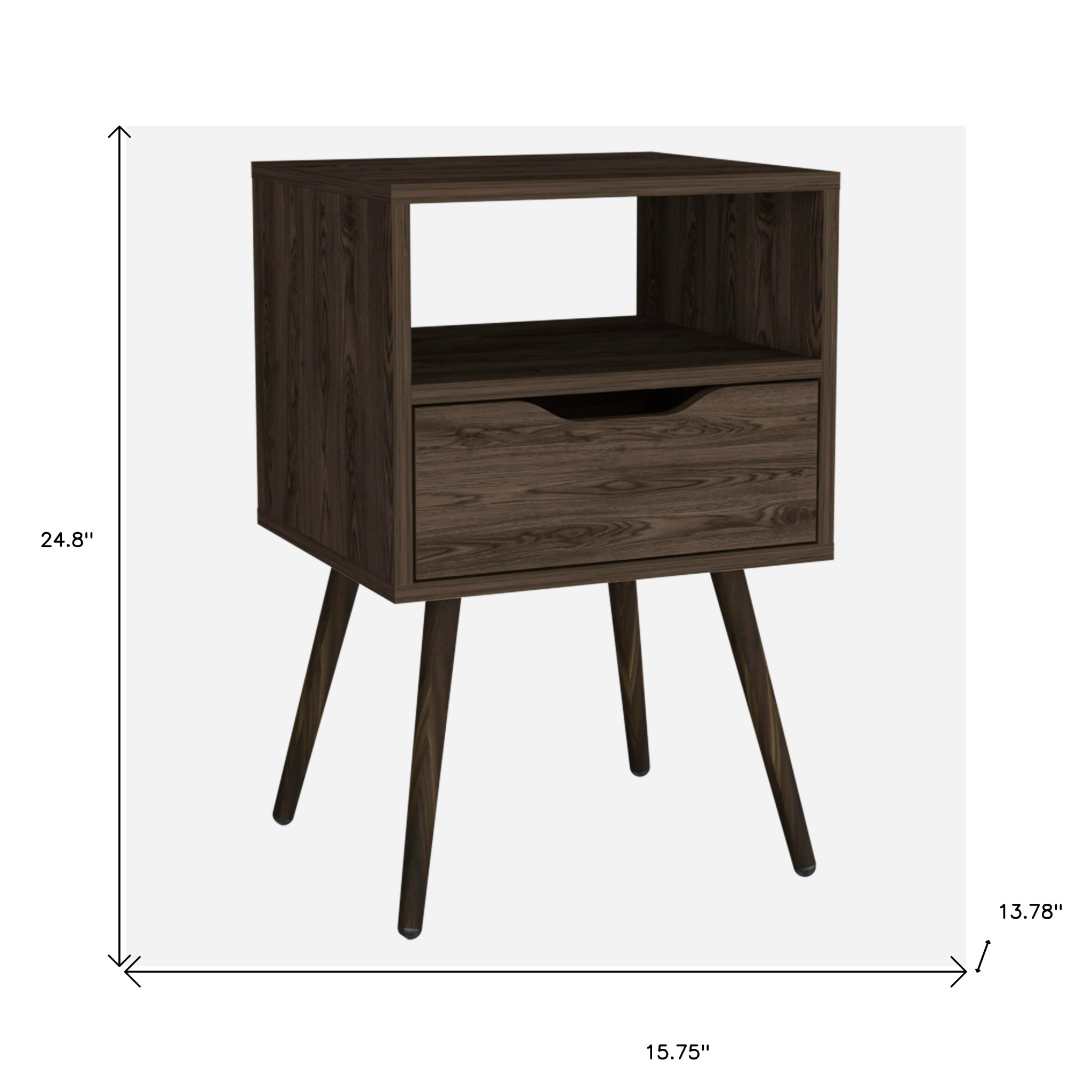 Our 25-inch brown one drawer faux wood nightstand will compliment your bed beautifully. Sturdy and durable construction from manufactured wood ensures this trusty bedside table is built to last. The easy open drawer allows you hidden storage to keep your essentials close at hand. An easy-access shelf gives you additional storage and display space. The unsung hero of the bedroom, this nightstand is perfect for keeping a glass of water, lamp, alarm clock, jewelry, and more, close by and easily accessible. Look no further than this nightstand to accommodate all your needs and upgrade the style of your bedroom. 24.8-inch H x 15.75-inch W x 13.78-inch D