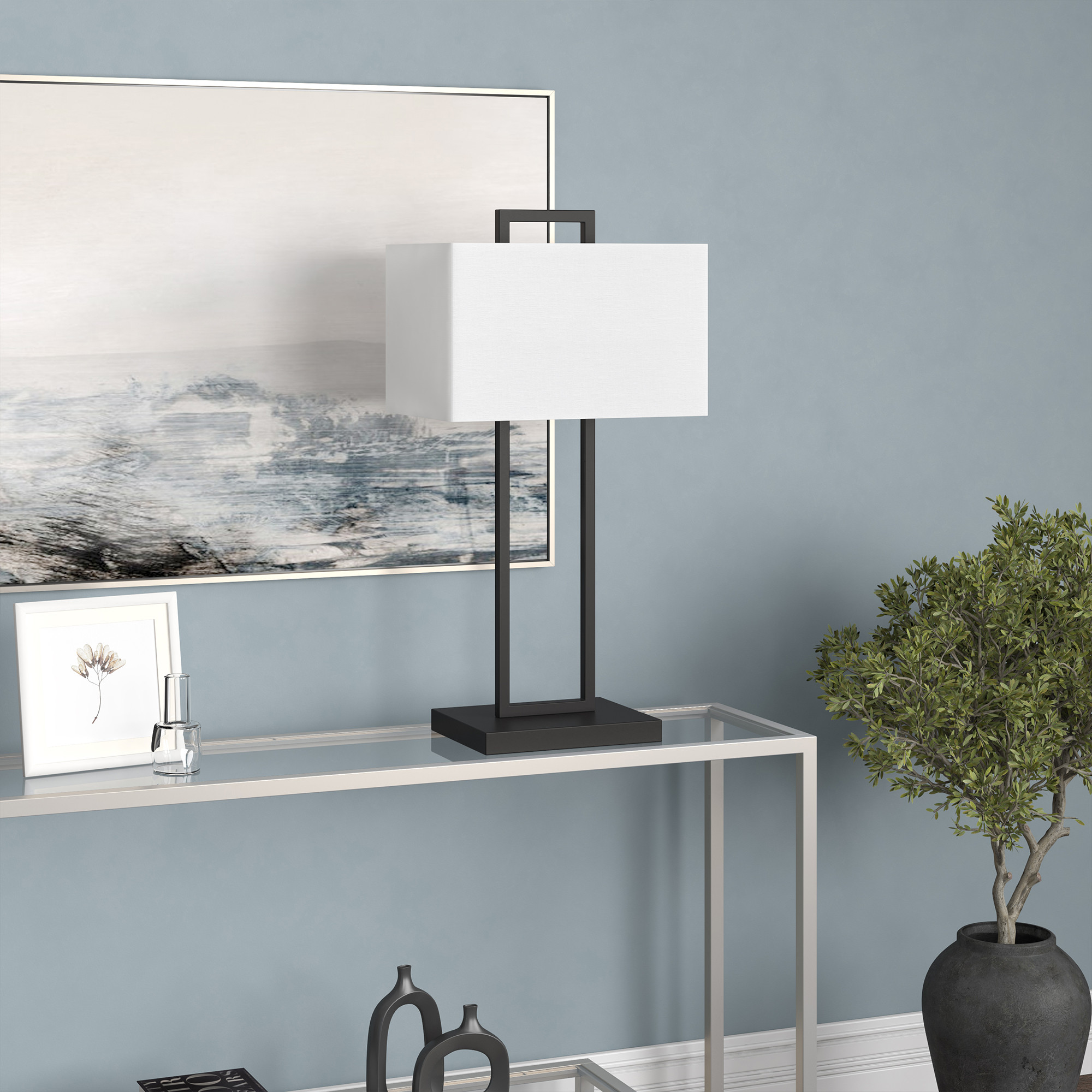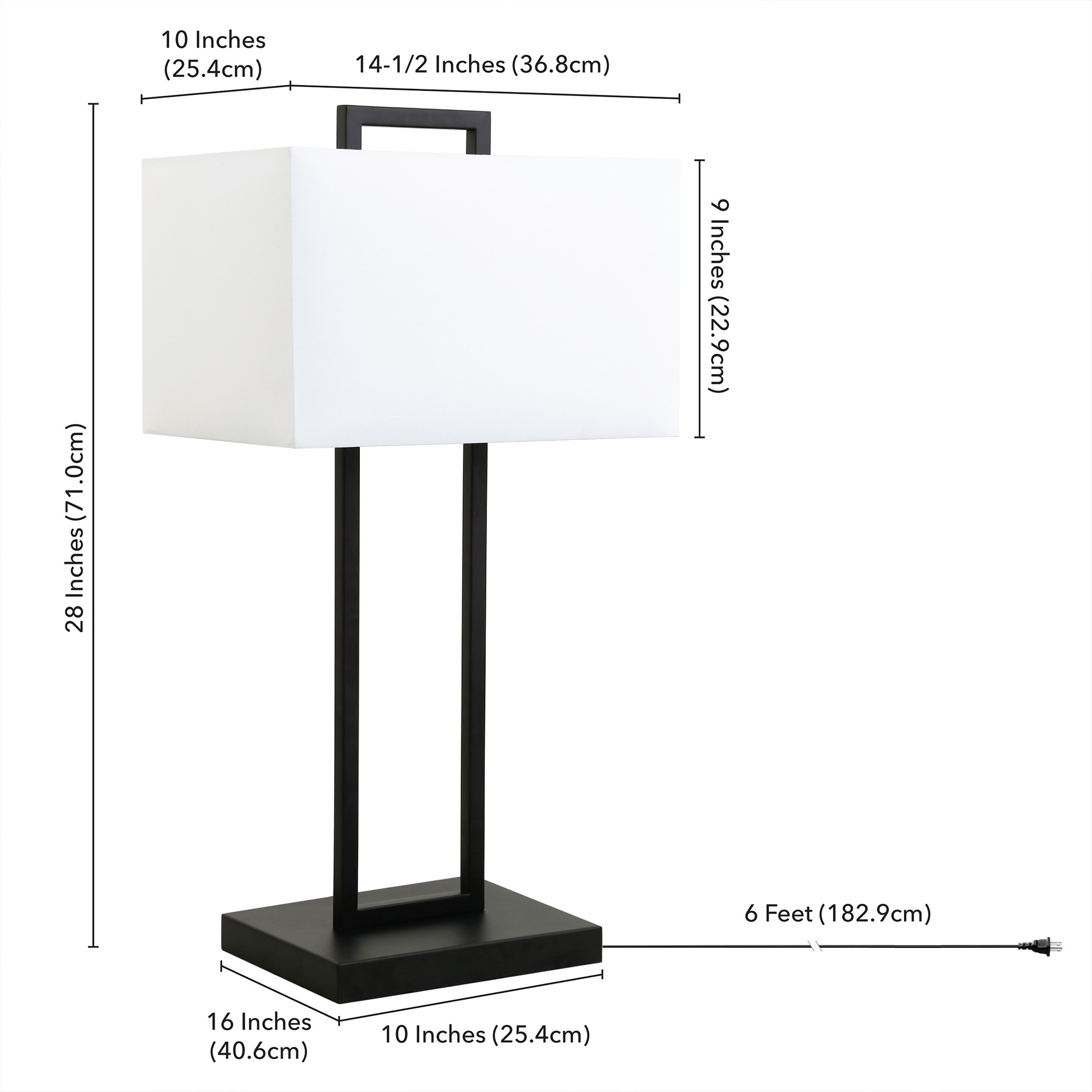 With this 28-inch black metal table lamp with white shade you can bring in design to any space along with adding some ambient lighting. The lamp is made of sturdy metal and features a black color. The white shade has a rectangular shape and is made of fabric, which makes it a perfect choice. This standard table lamp is designed to provide general lighting to the area. High quality design makes this a great lamp for not only lighting, but accenting a room with style. The perfect lamp to create just the right natural and soothing light in your space. 28-inch H x 14-inch W x 10-inch D
