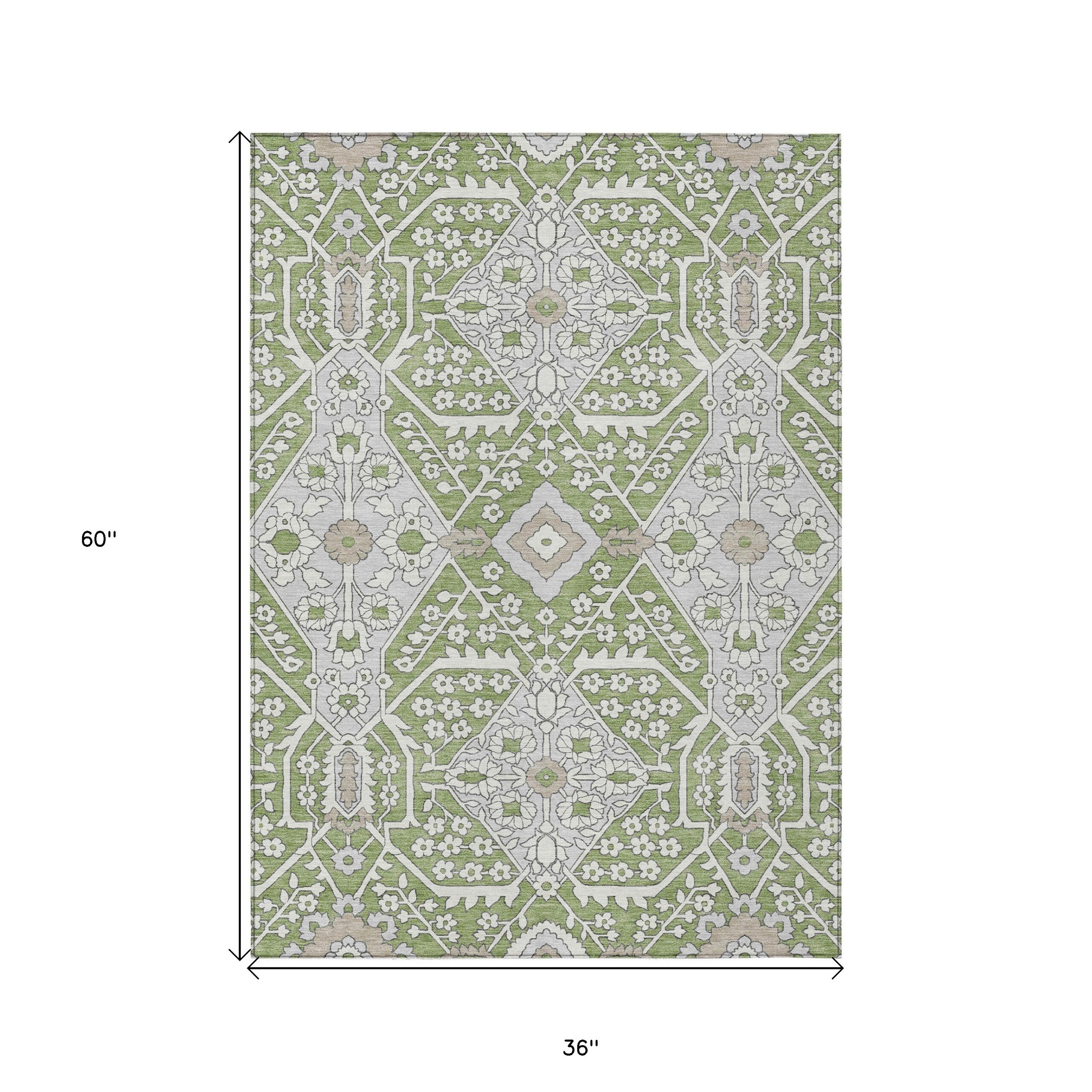 3' X 5' Artichoke Green Ivory And Gray Floral Washable Indoor Outdoor Area Rug