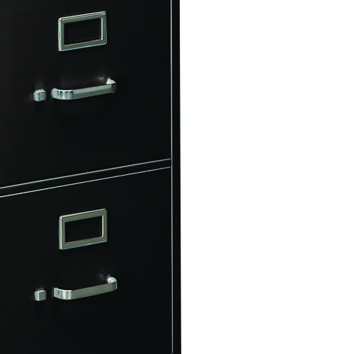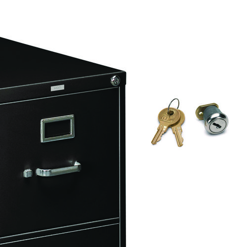 Commercial-grade files to meet your long-lasting needs. Tilt and slide follower block in each drawer keeps files upright and neat. High drawer sides add strength and serve as front-to-back hangrails. Thumb latch keeps drawers safely closed. Label holders for quick and easy identification of contents. HON® “One Key” core removable locks. Steel ball bearing suspension.