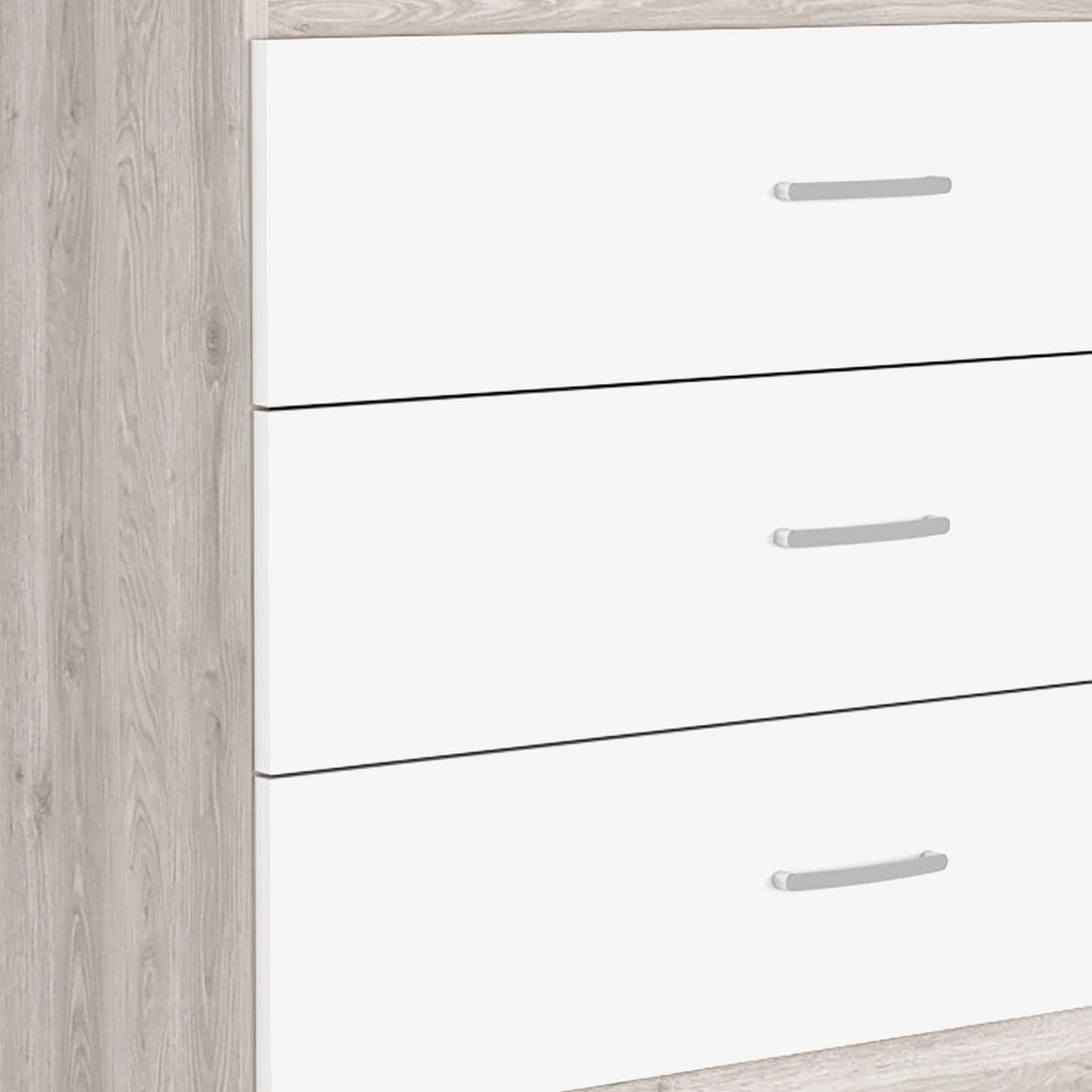 Make your room functional and visually enticing with this masterful 32-inch white and gray three drawer dresser. This horizontal standard dresser has a convenient and wide top area for your getting ready needs and supplies. Equipped with three easy open drawers for practical and good looking clothing storage. Its a high quality piece, made from high grade manufactured wood. 29.7-inch H x 31.5-inch W x 16-inch D