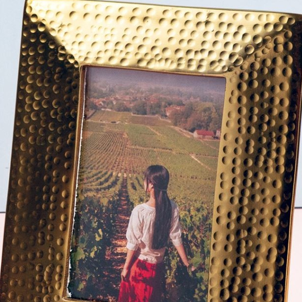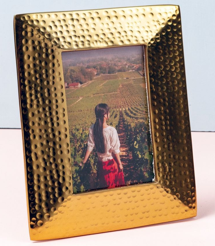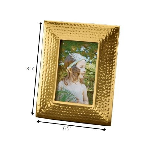 Celebrate the unforgettable memories of your loved ones with this Hammered Golden Picture Frame that strikes a classic look with its color and texture. Hand-Crafted with tin in a luxurious gold finish with hammered textures that add to the traditional look and elegance. Made to accommodate vertical photos, this gorgeous photo frame will make its mark in any modern or traditional living space. Flaunt your favorite photo to decorate your home, which speaks of the moments that hold special value in your heart. An ideal piece to keep on a desk or side table, this picture frame is one-of-a-kind to accentuate a sense of charm and glam. Total Frame Dimensions 6” x 5.5” x 4”