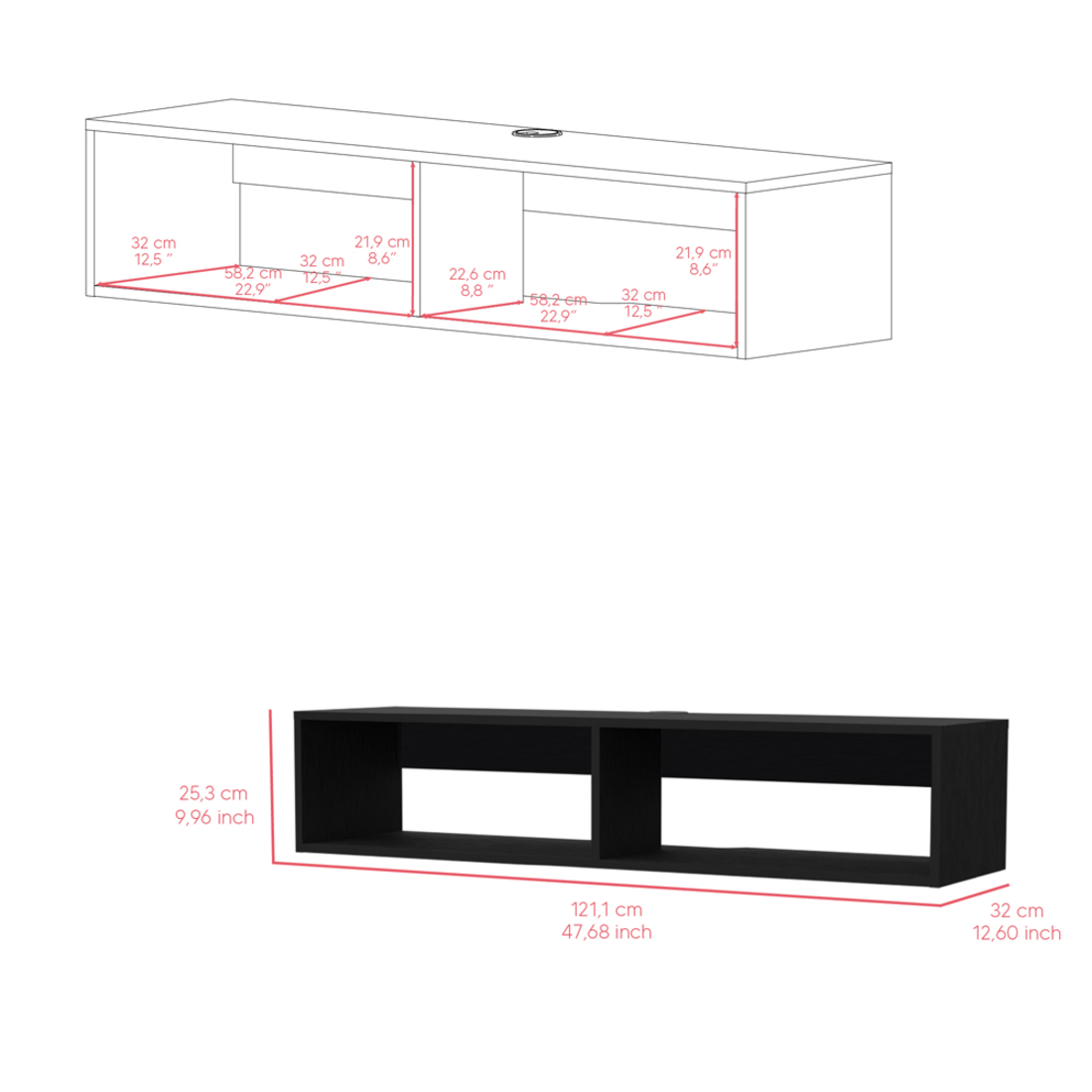Create the ultimate blend of style, function, and design with this 48-inch black floating mount TV stand. To add to the versatility, this piece features open non-concealed space that can be used for not only storage but display as well. The sleek and modern floating wall mount design will elevates the design of the room while saving floor space at the same time. Ideal for your living room, bedroom, or office. 9.96-inch H x 47.68-inch W x 12.6-inch D