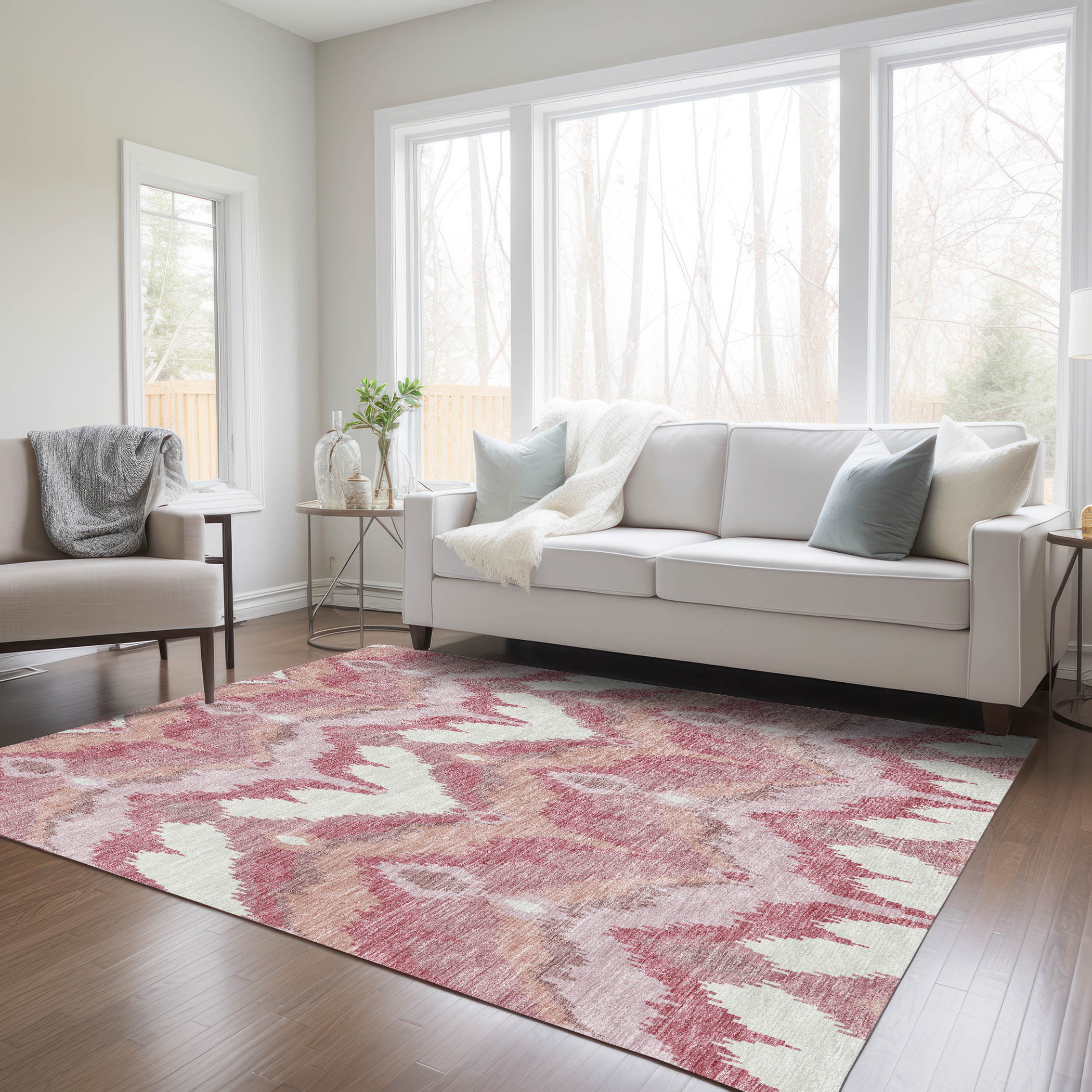 This 5-foot x 8-foot blush mauve and ivory ikat washable indoor outdoor area rug, is a great way to add warmth to a room. This rectangle shaped rug features a ikat design that will work well both indoors or out. A classic shape marries with good looking design for your living room, hall, bedroom, porch, patio, or poolside. Ideal for outdoor spaces or high traffic areas with kids and pets, this rug is made from heavy duty polyester that is stain resistant to help repel water, dirt, and stains. Versatile in use, durable, and easy to maintain, this rug is an ideal solution to add a decorative and inviting touch to your indoor or outdoor space. 60-inch h x 90-inch w x 0.19-inch d.