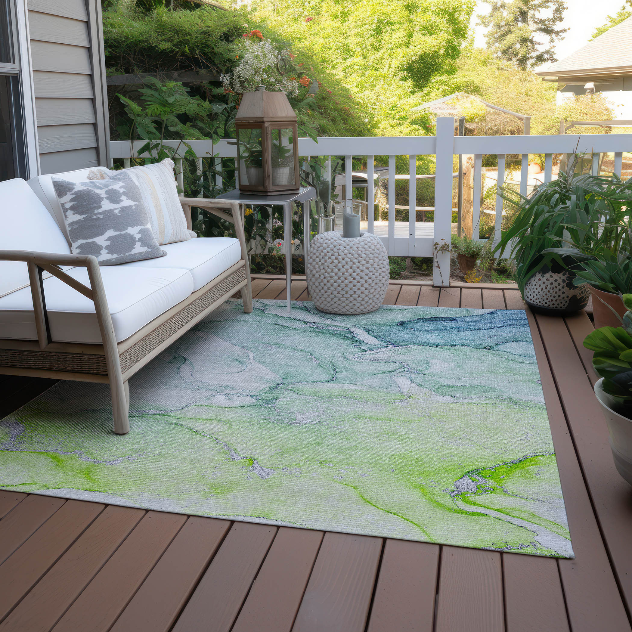 Add great coloration and comfortable texture to your space with this 5-foot x 8-foot green abstract washable stain resistant non skid indoor outdoor area rug. This rectangle shaped rug features a abstract design in green to give it visual interest. A classic shape marries with good looking design for your space ideal for spaces with kids and pets, this rug is stain resistant to help repel stains and spilled liquids. Area rugs help to give warmth and sense of home to your space. 60-inch H x 90-inch W x 0.19-inch D