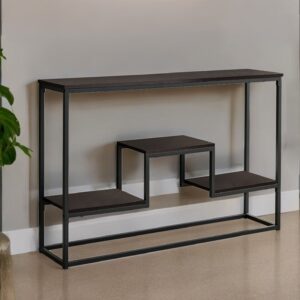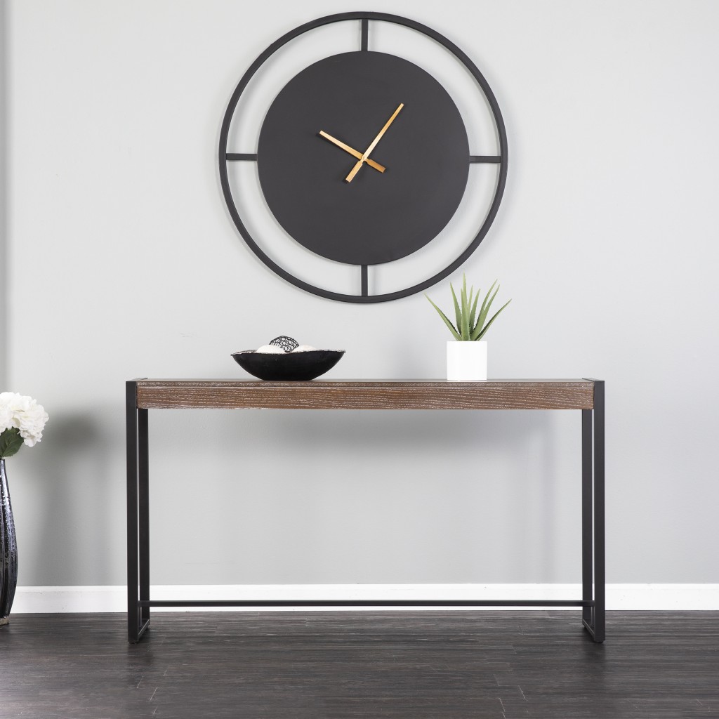 Transform your home with our elegant and versatile 54-inch brown and black sled console table. Don’t miss out on the perfect finishing touch for your home. This rectangular table has clean lines and plenty of surface area. This table has a top made with brown manufactured wood that is known for durability and easy maintenance. Ideal for living rooms, bedrooms, home offices, and lounge areas, this console table is not only good looking but multi-functional and practical addition to your space. 29.75-inch H x 54-inch W x 11.5-inch D