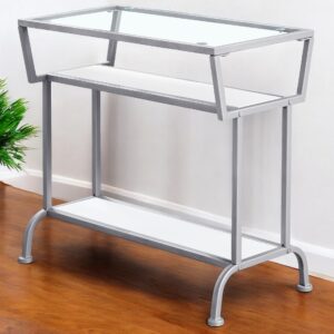 This 56-inch silver and gold mirrored glass console table is a high-quality, long-lasting piece of furniture that you can enjoy for years to come. This rectangular table has clean lines and plenty of surface area. Versatile in use, console tables can be used for a variety of purposes in a variety of rooms and settings. 30-inch H x 56-inch W x 8-inch D