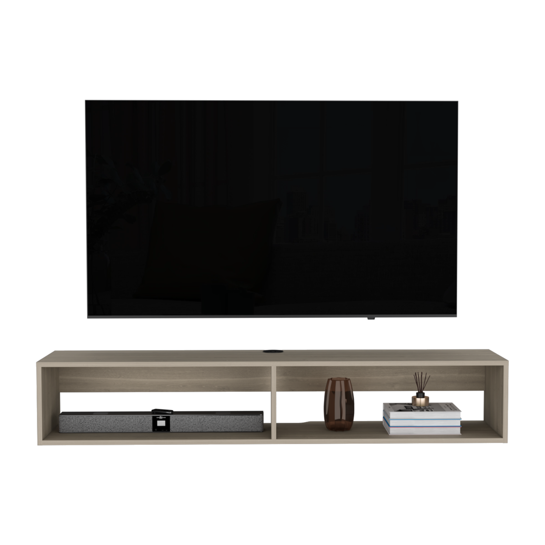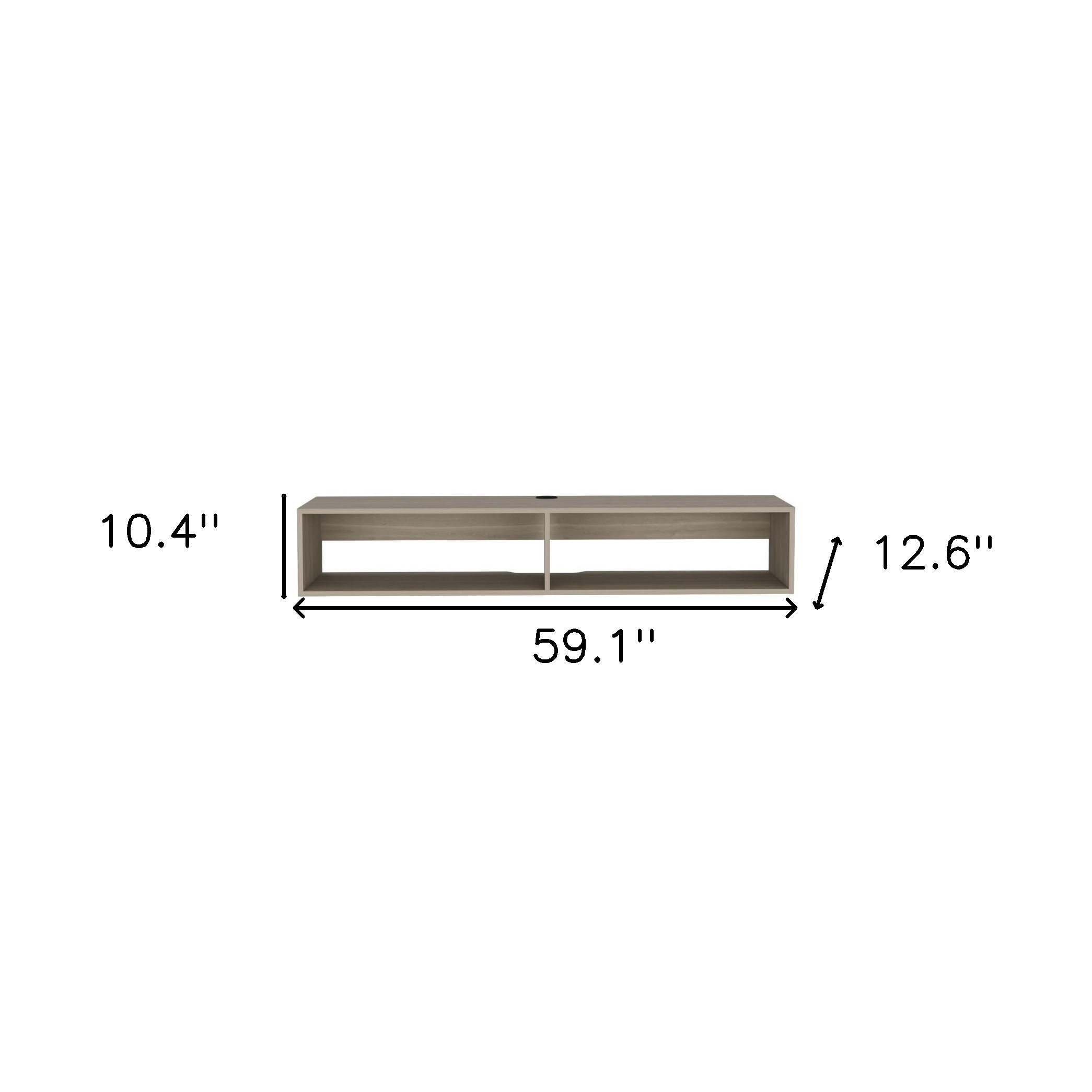 Create the ultimate blend of style, function, and design with this 59-inch beige floating mount tv stand. To add to the versatility, this piece features open non-concealed storage that can be used for not only storage but display as well. A built-in cable and wire management helps to keep those unseemly wires at bay. Convert your room into a special place with your favorite collectibles and tv accessories that is suitable for living room, bedroom, or office. 10.4-inch H x 59.1-inch W x 12.6-inch D