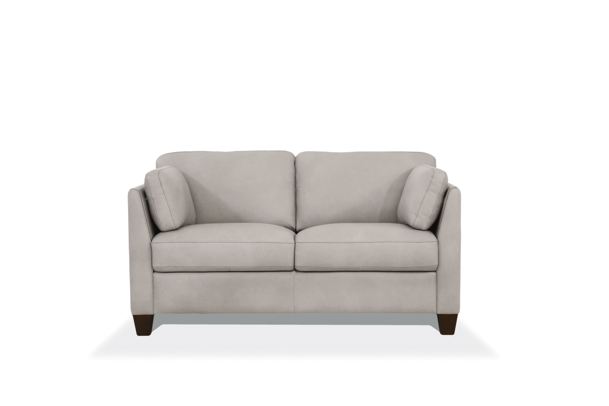 Made of top quality, supple leather, this 59-inch dusty white and brown leather loveseat will be the star of your space. The high grade premium leather used makes your lounging luxuriously comfortable and adds an elegant appeal to your space. Square arms offer a comfy place to rest and give this piece some interest and shape. A great showpiece for your room, this sofa is a must have. 31-inch H x 59-inch W x 34-inch D