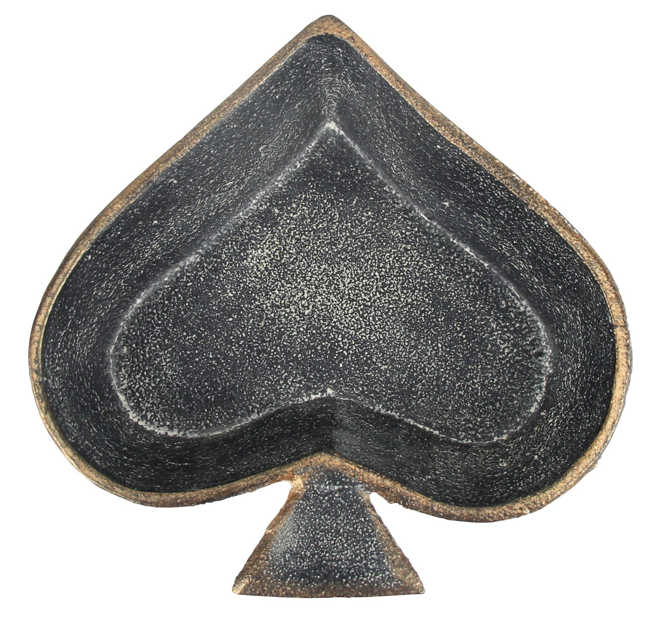 Made from cast iron metal, this durable spade vanity tray is perfect to use as decor, as a catchall, or as a showcase for other objects just as beautiful as it is. With a rustic / rough hewn finish, this piece will be a beautiful decorative accessory for your dresser, desk, bookshelf, or table. Intended for decorative use, it’s perfect for displaying a collection of small candles, keys, coins, perfumes, jewelry, and more. 1.25-inch H x 6.25-inch W x 6-inch D