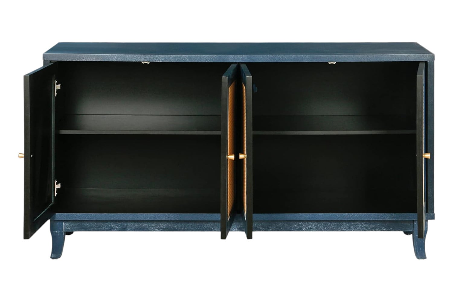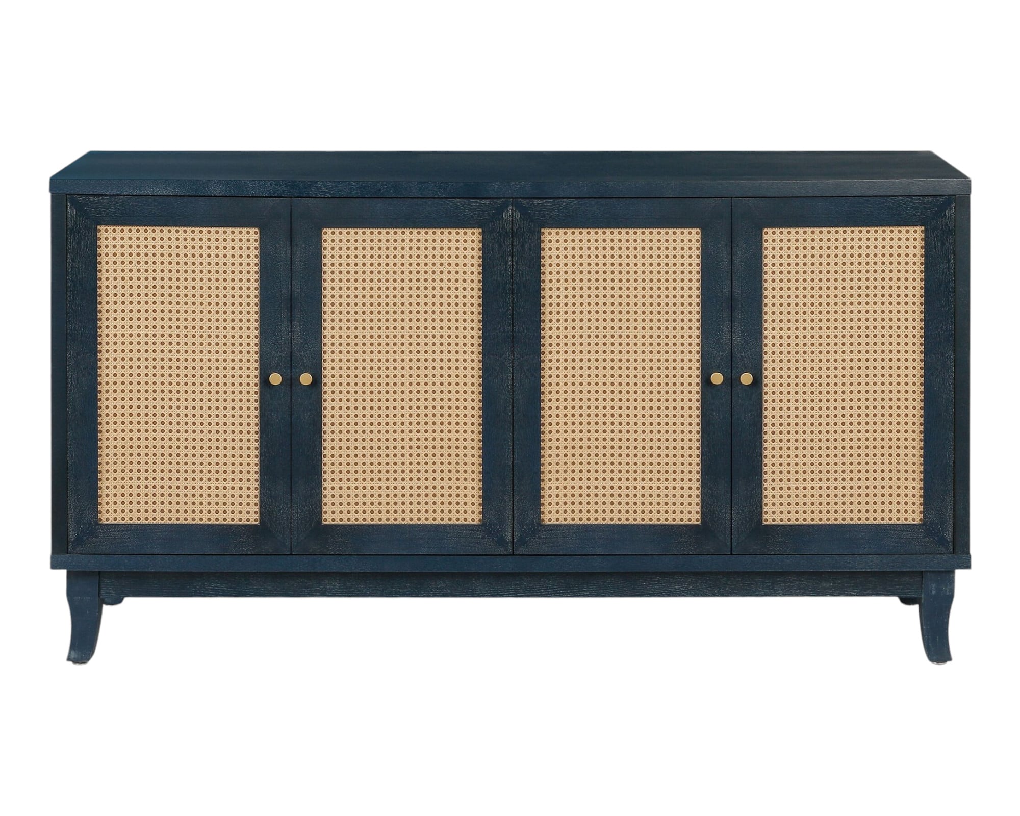 Storage vessels don’t have to be unsightly. Increase your storage space and the fashion quotient of your room with this hard-wearing, versatile, and good-looking manufactured wood sideboard in a stylish blue and beige color scheme. Featuring shelves and open storage for practical organization, this modern piece boasts a coat/paint distressing for added character. The wood and rattan door design, complemented by gold hardware finishes, adds a touch of elegance to your living space. 32.3-inch H x 59.8-inch W x 15.6-inch D