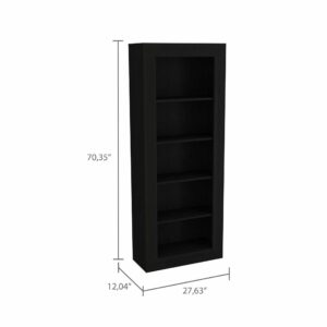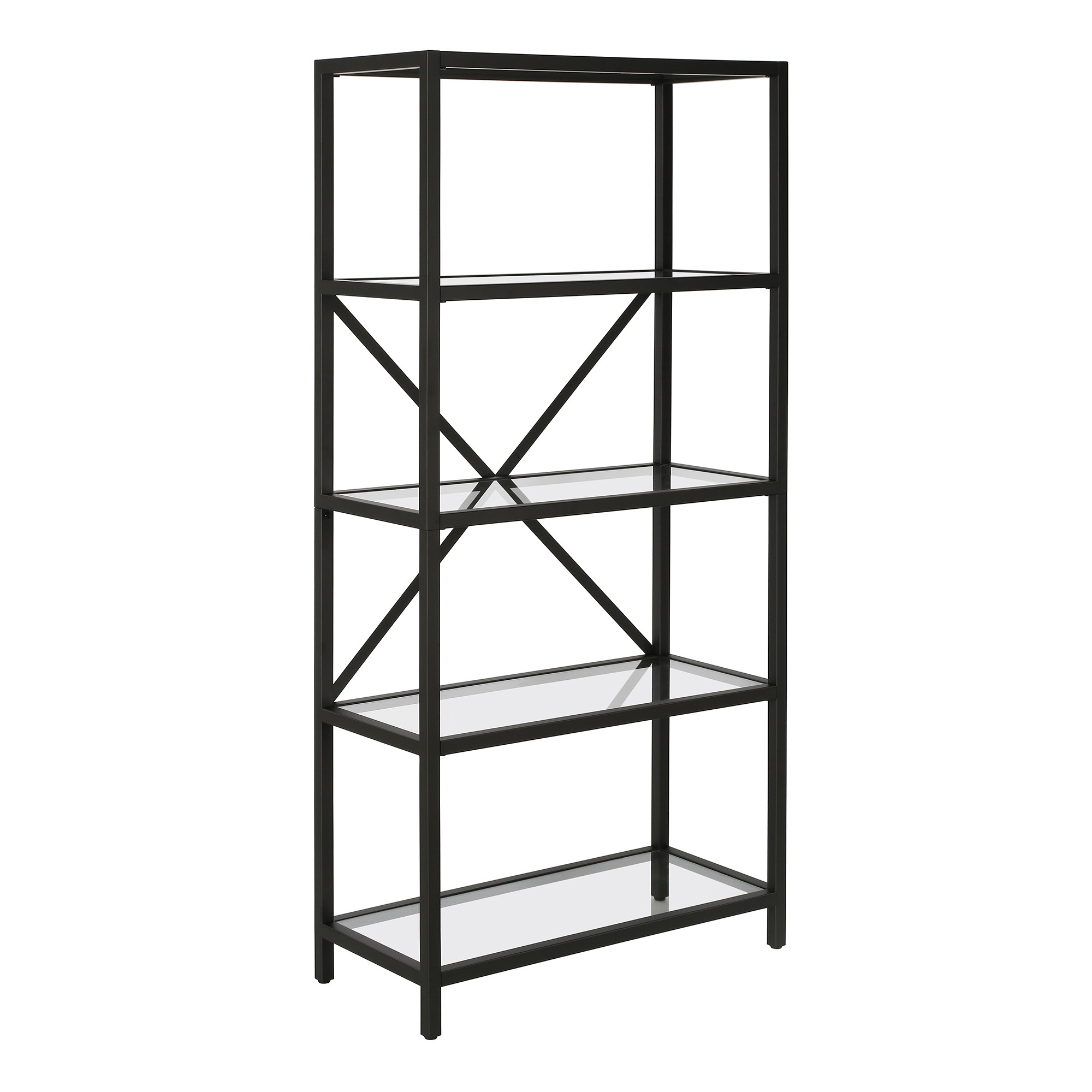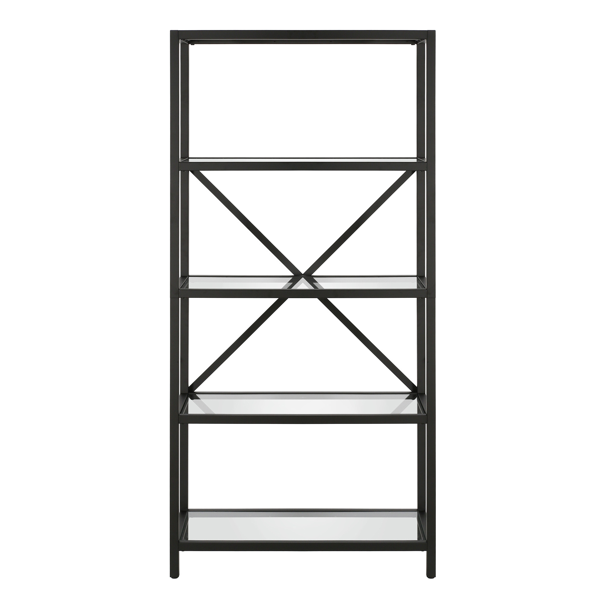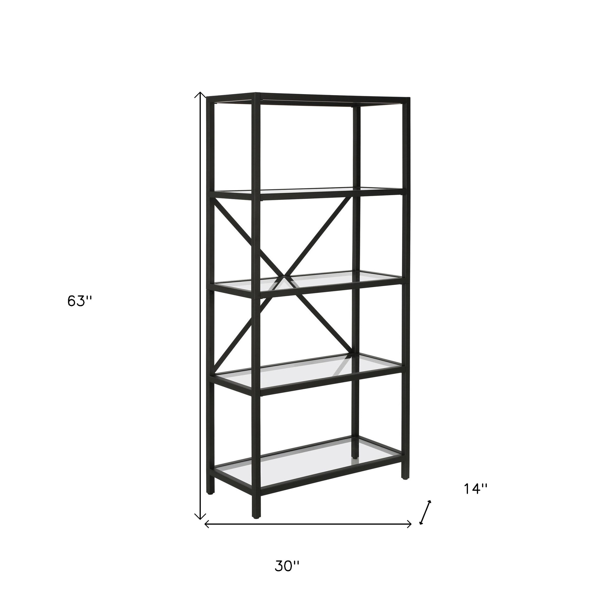 Sturdy and built to last, this 63-inch black metal and glass five tier etagere bookcase helps you display your books, files, photos, and treasures in an organized fashion. Features 5 shelf tiers for storing books, displaying photographs, plants, or other decorations. Great to use independently or pair with additional units to create a different look and add even more storage. Increase your room’s capacity for storage and display with this great shelving unit. 63-inch H x 30-inch W x 14-inch D
