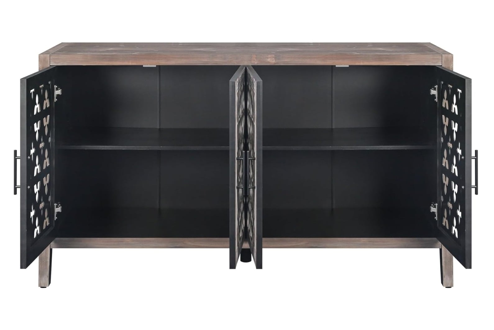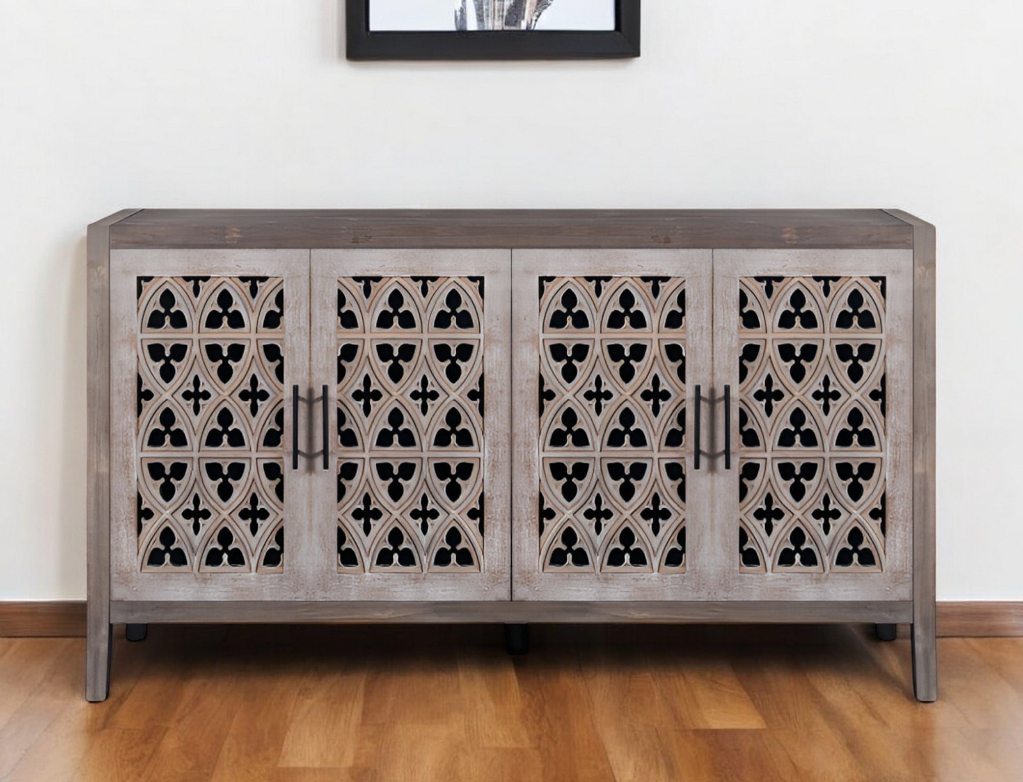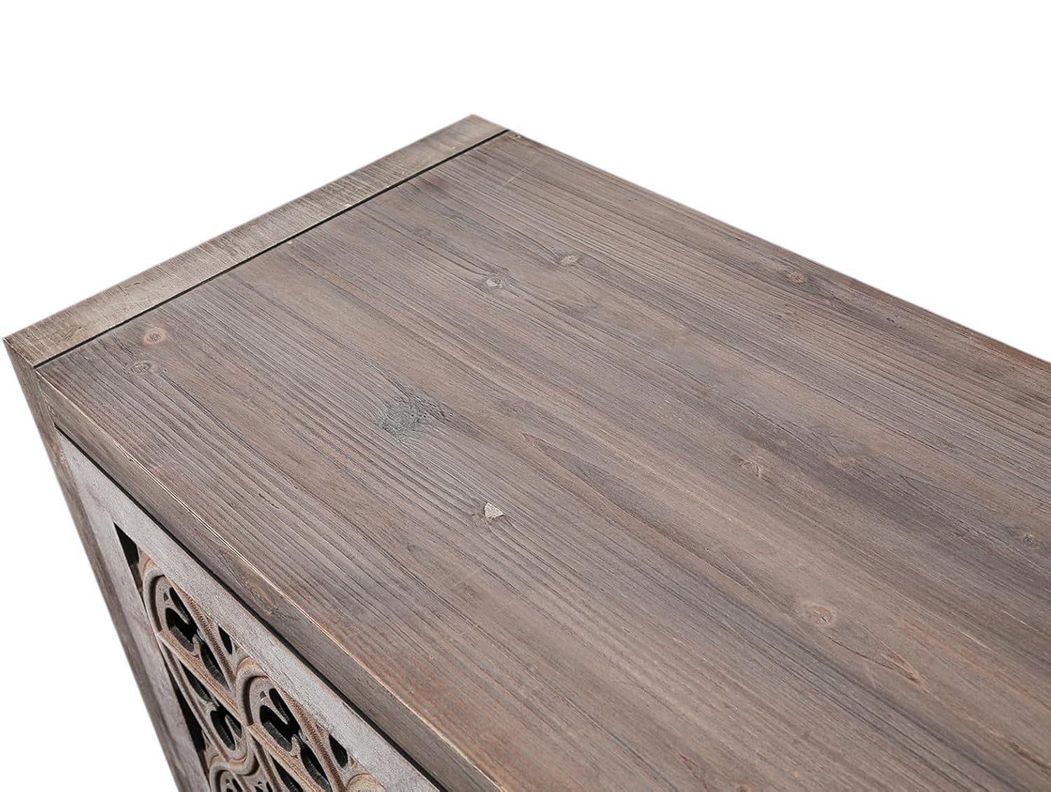 Storage vessels don’t have to be unsightly. Increase your storage space and the fashion quotient of your room with this hard-wearing, versatile, and good-looking sideboard. Crafted from manufactured wood, this modern-style piece features coat/paint distressing for a stylish look. The sideboard boasts open storage with shelves included, perfect for displaying your favorite decor pieces. The rich brown color and intricate carved scrollwork detailing on the wood scrollwork doors add a touch of elegance to your living space. Ideal for both storage and visual appeal, this sideboard is a must-have for any home. 32.3-inch H x 62.75-inch W x 15.6-inch D