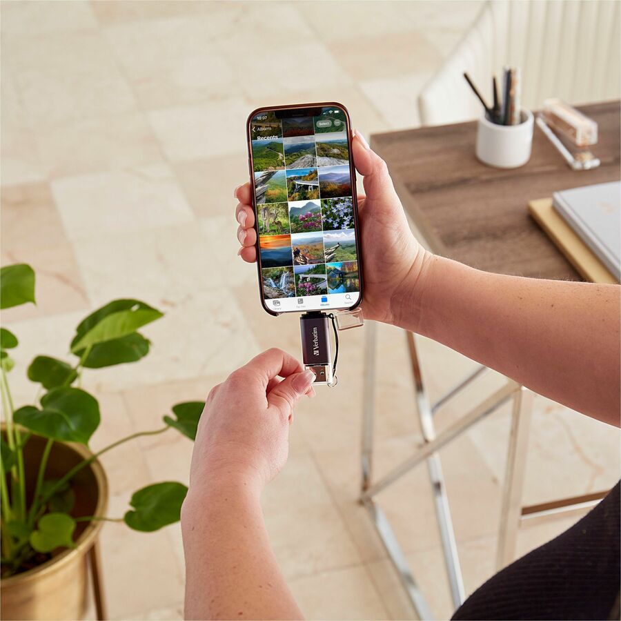 Exchange files quickly and easily between your Apple device and USB-equipped PC with iStore 'n' Go Dual USB 3.0 Flash Drive. Instantly add 64GB of storage to your iPhone, iPad or other Apple device so you have room to capture more photos and video or free up memory for new content. MFi certified, this drive is designed for use with Apple iPhone, iPad and iPod products, ensuring the highest quality and reliability. Using Verbatim's free iStore 'n' Go app, available for download from the App Store, you can transfer and view content on your drive. Transferring those files to your PC is a snap – simply insert the drive into a USB port and move content as you please. USB flash drive is compatible with iPhone 6/6S, iPhone 6/6S Plus, iPhone 5/5S/5C, iPad mini/mini 2/mini 3/mini 4, iPad 2nd/3rd generation, iPad Air/Air 2, iPad Pro and iPod Touch 5/6. <p><a id="gfk-spex-minisite" rel="nofollow" href="javascript:void(0)" onclick="javascript:window.open('//content.etilize.com/mini-site/en_us/1034808451.html', '_blank', 'height=800, width=780, resizable=yes, scrollbars=yes, toolbar=no, menubar=no, location=no, directories=no, status=no'), return false, ">More from the Manufacturer</a></p>