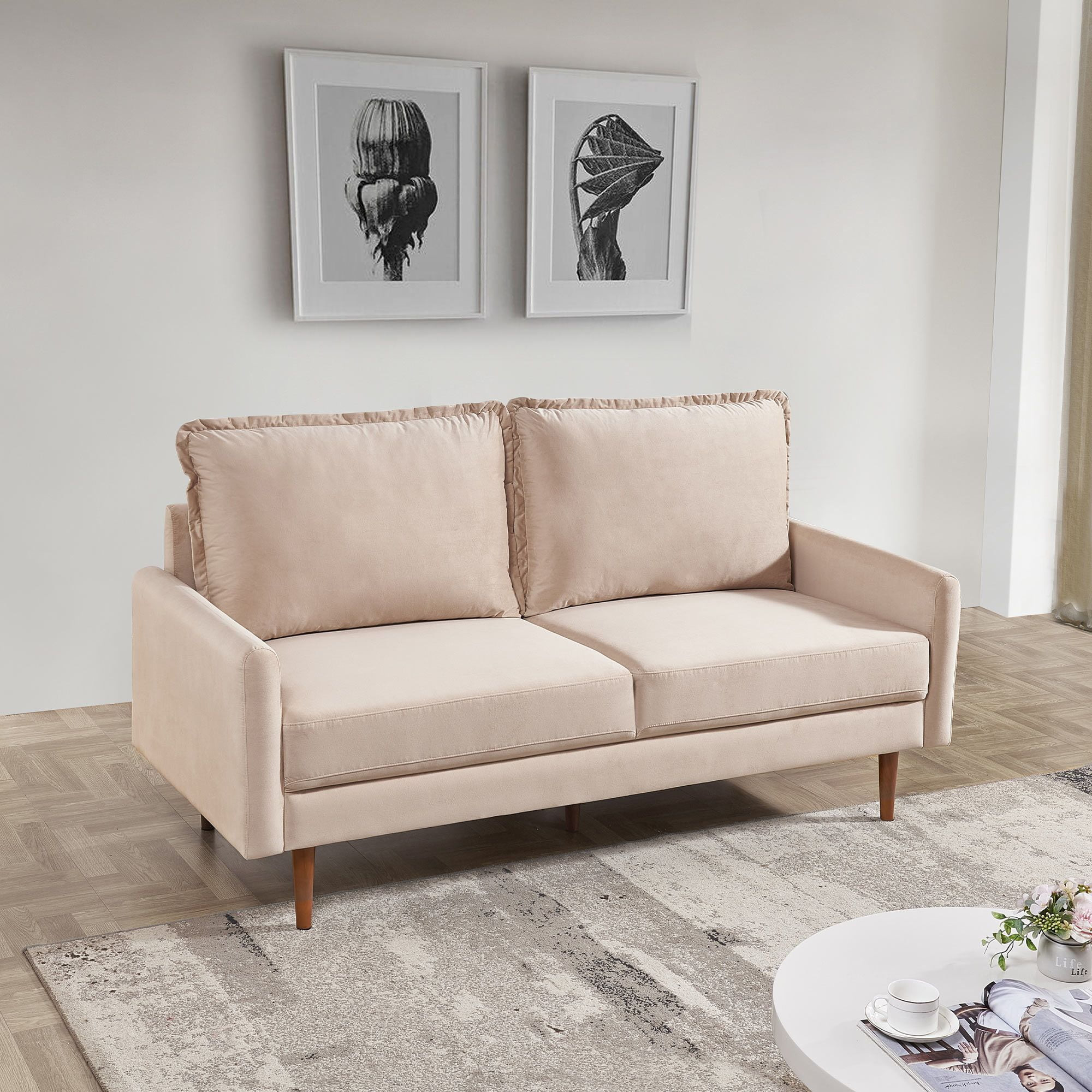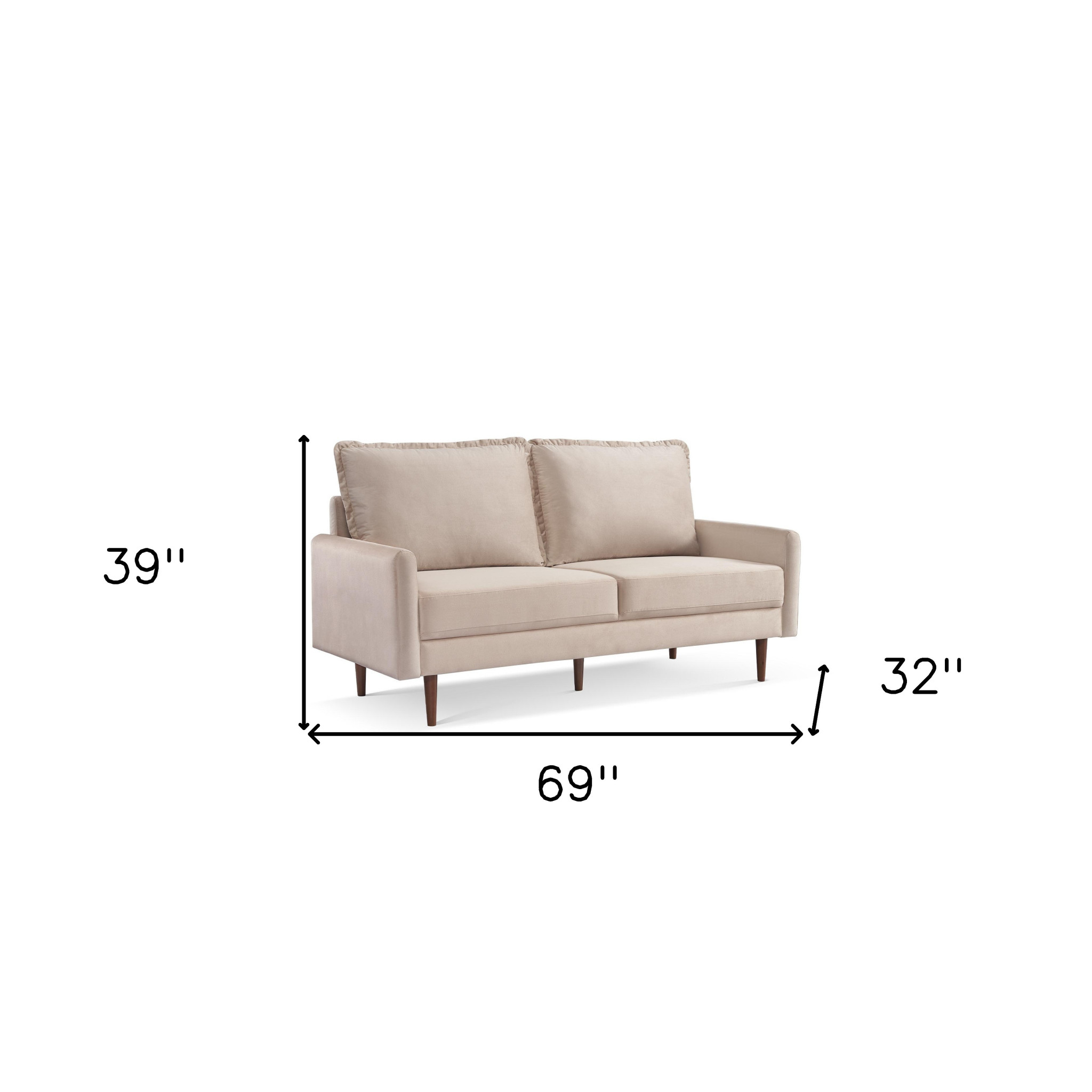 Add an air of fashion to your space with this fabulous 69-inch beige velvet and dark brown sofa. This solid color standard is made from sturdy and resilient velvet that has a warm and rich look and is a super soft and comfortable to the touch. Solid colors give you lots of decorative options and are easy to work into your decor scheme. Pocket spring construction gives this piece strong support and makes it comfortable to sit even for long periods of time. Track arms offer a comfy place to rest. Dark brown solid wood legs effortlessly elevate the room and add a touch of contemporary design. Built to last, this sofa will be a great centerpiece for your room. 39-inch H x 69-inch W x 32-inch D
