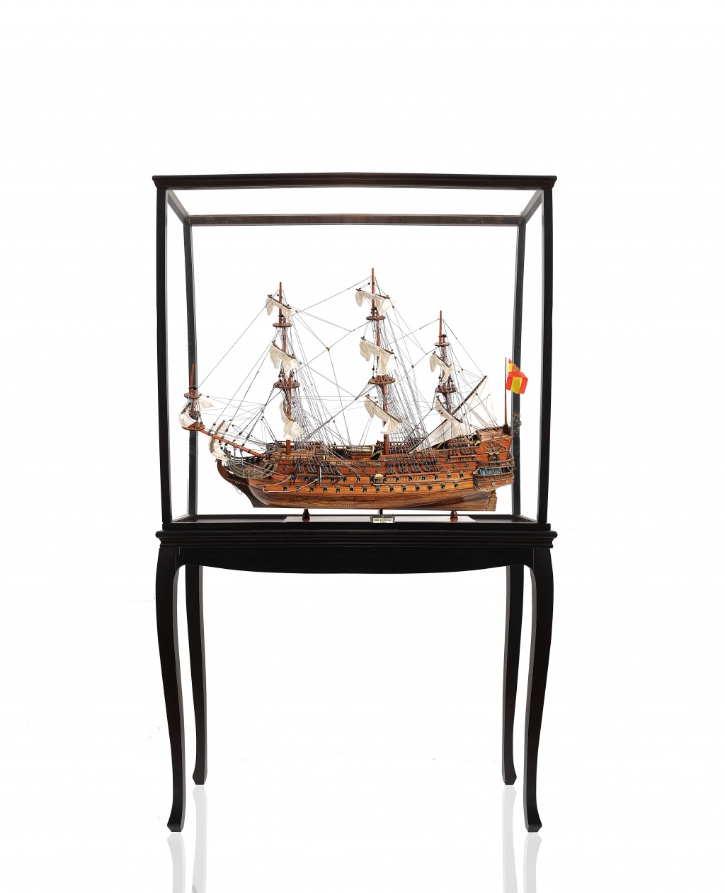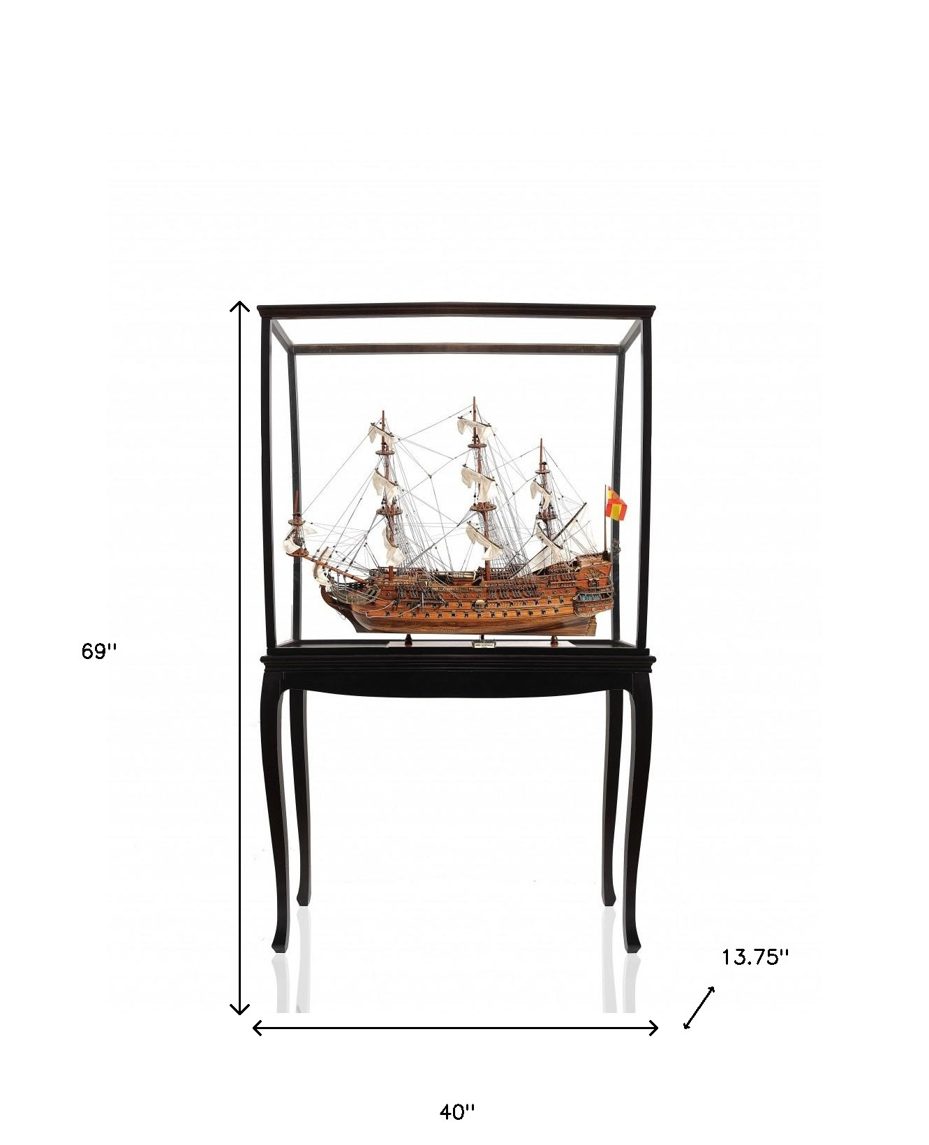 Eye-catching and incredibly detailed, the San Felipe Large Floor Display Ship Model is a unique hand-built model of the 96 gun Spanish Armada flagship unveiled in 1690. Handmade by the most talented craftsman using high-quality wood like western red cedar, rosewood, and mahogany. Each model requires hundreds of hours of painstaking plank-on-frame construction and detailing. It includes incredible details as three decks, three rows of cannons on each side, hand-stitched linen sails, and other meticulous detailing. It comes in a floor display case with a solid wood base and brass nameplate. It is a true gem for any collector or maritime enthusiast. 69″ H x 40″ W x 13.75″ D