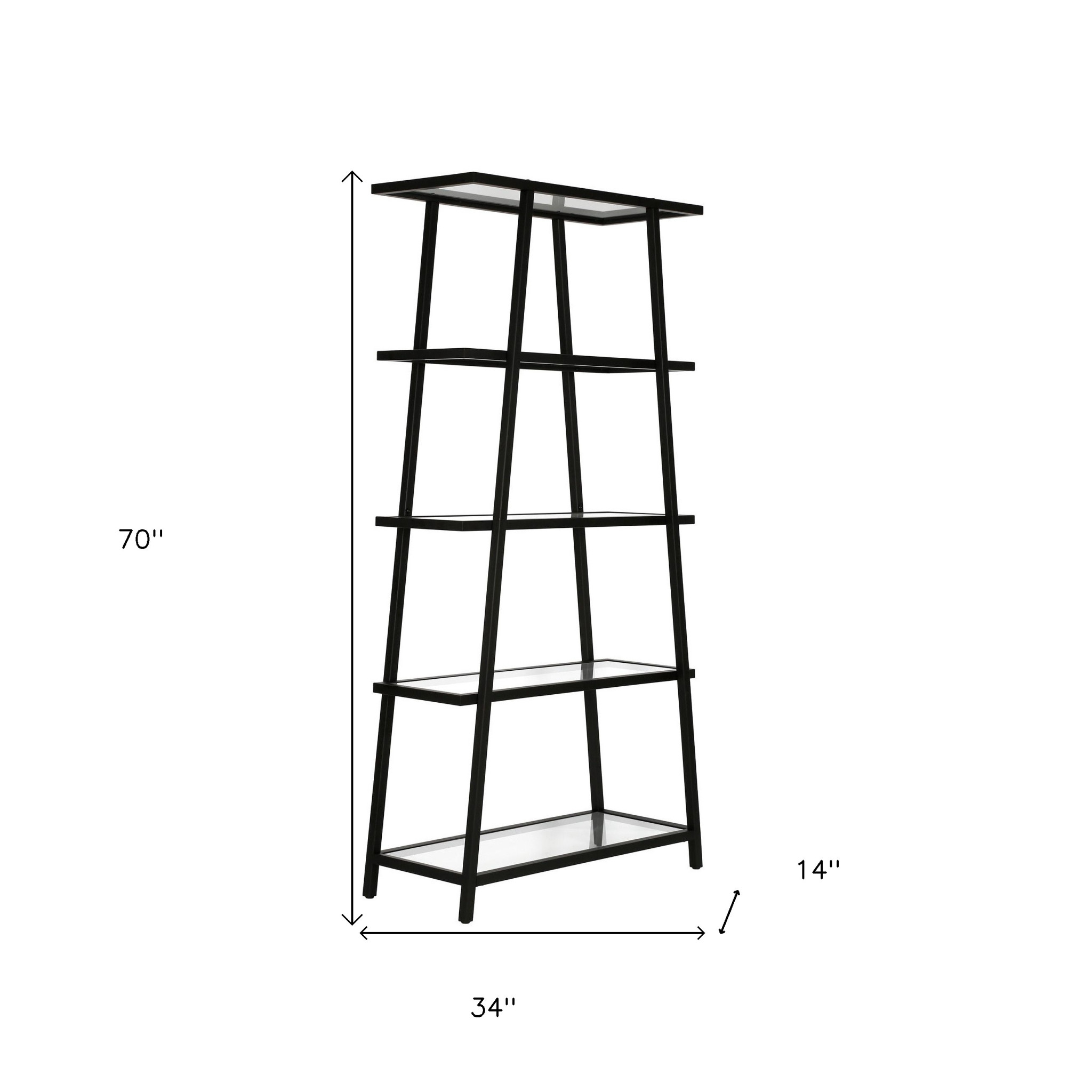 The 70-inch black metal and glass five tier etagere bookcase offers you storage and display space in a good looking and refined manor. The functional 5 shelf tiers offer fantastic storage space. This bookcase is perfect for use alone or in multiples in most any living or office space. Increase your room’s capacity for storage and display with this great shelving unit. 70-inch H x 34-inch W x 14-inch D