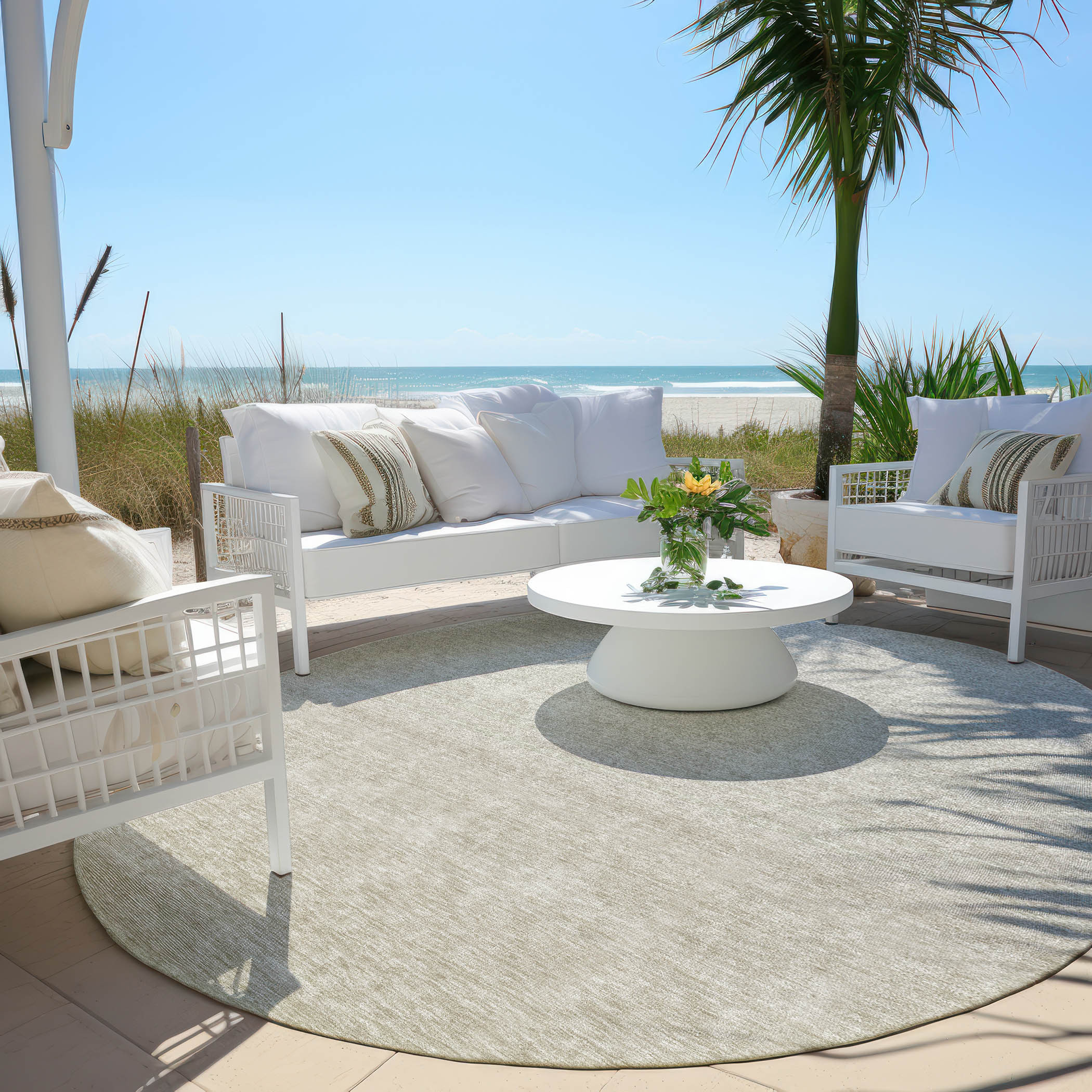 This 8-foot beige tan and taupe round ombre washable indoor outdoor area rug, is a great way to add warmth to a room. This geometric round shaped rug features a ombre pattern in beige, tan, and taupe that combines a good looking print with a unique and updated shape. The mix of shape, color, and design gives this rug refreshing visual interest. Ideal for outdoor spaces or high traffic areas with kids and pets, this rug is made from heavy duty polyester that is stain resistant to help repel water, dirt, and stains. Versatile in use, durable, and easy to maintain, this rug is an ideal solution to add a decorative and inviting touch to your indoor or outdoor space. 96-inch h x 96-inch w x 0.19-inch d.