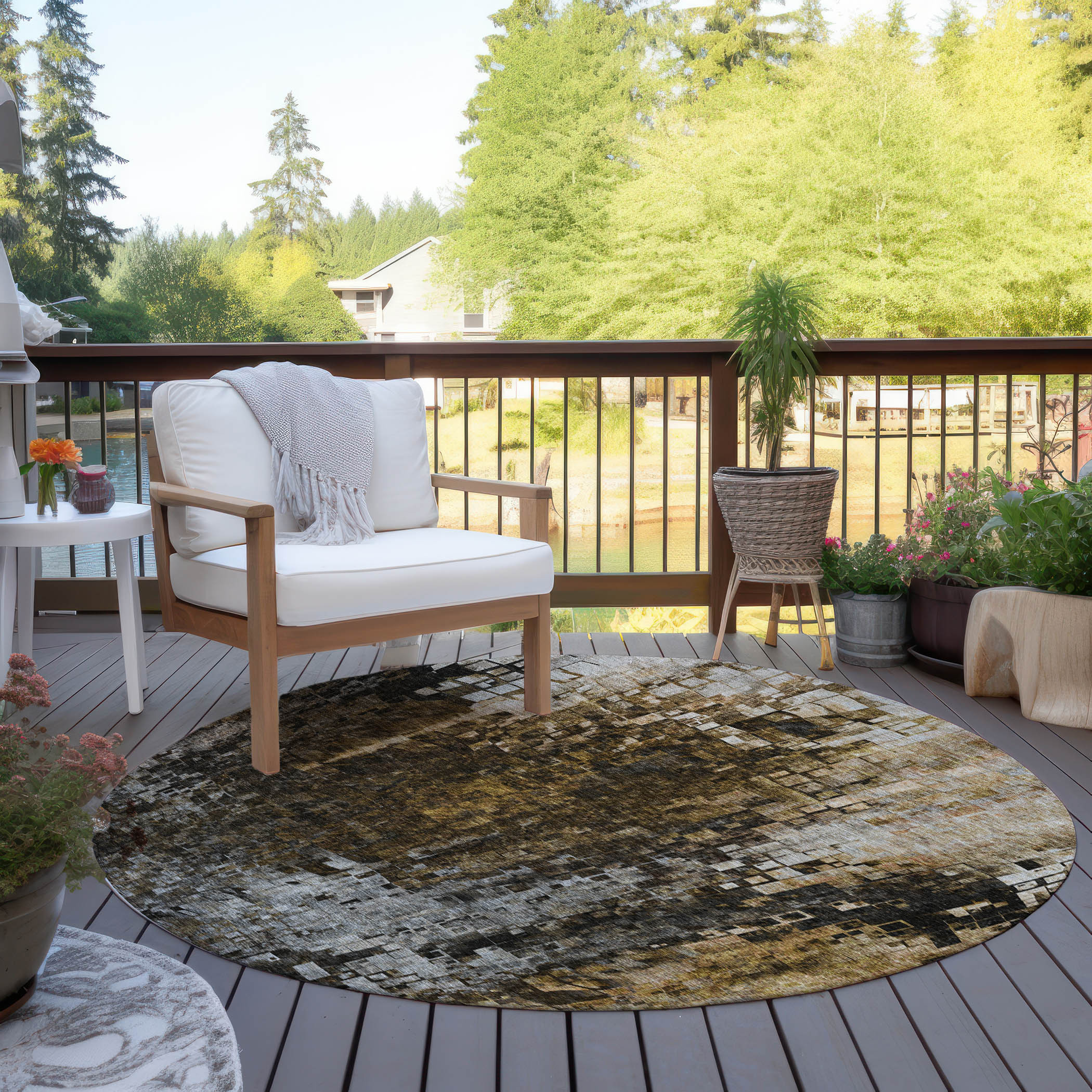 Add great coloration and comfortable texture to your space with this 8-foot brown and copper round abstract washable indoor outdoor area rug. This geometric round shaped rug features a abstract pattern in brown and copper that combines a good looking print with a unique and updated shape. The mix of shape, color, and design gives this rug refreshing visual interest. Ideal for outdoor spaces or high traffic areas with kids and pets, this rug is made from heavy duty polyester that is stain resistant to help repel water, dirt, and stains. Makes a great way to dress up your patio, porch, or poolside, but also works well as a durable and easy to maintain option in the kitchen, family room, or mudroom. 96-inch h x 96-inch w x 0.19-inch d.