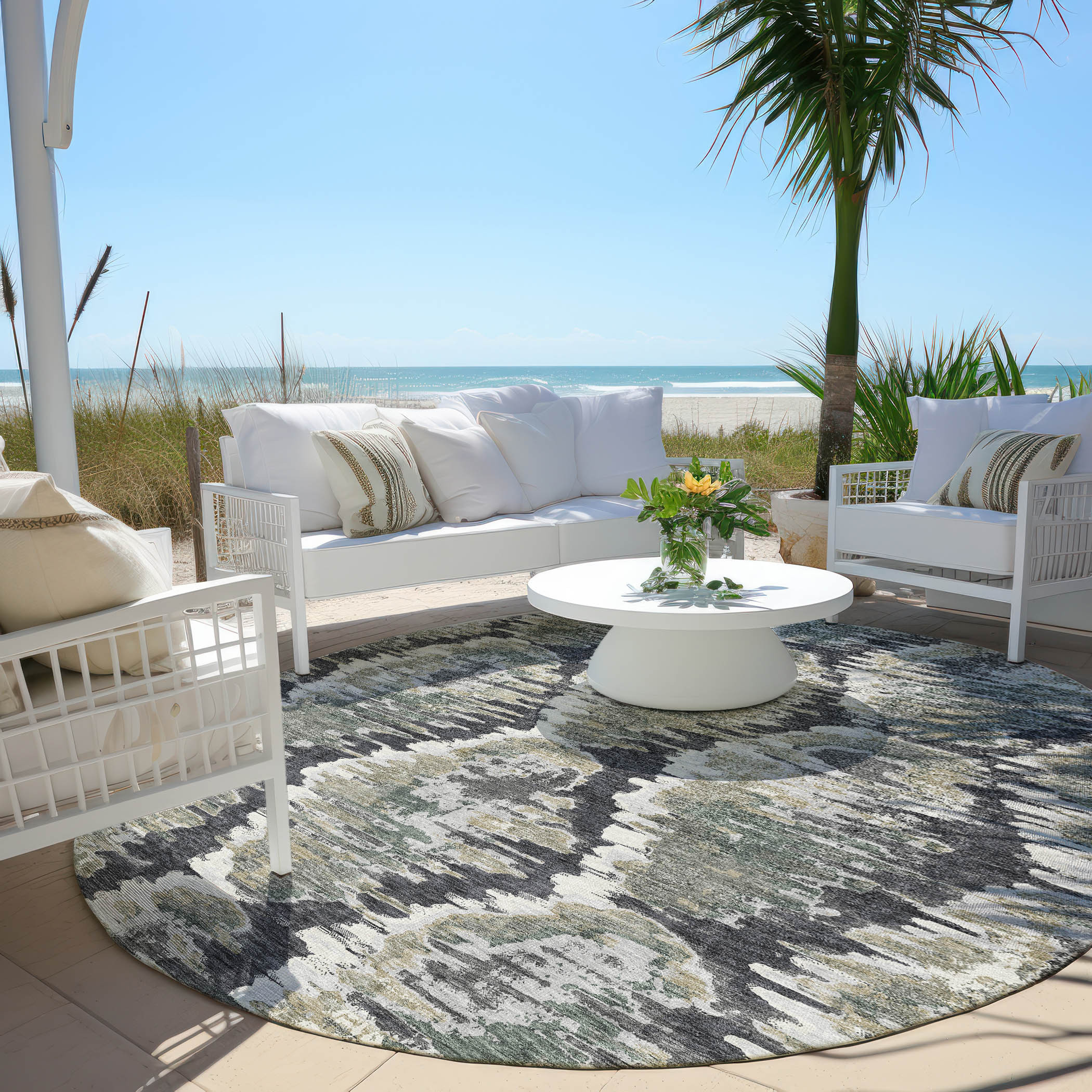 Add great coloration and comfortable texture to your space with this 8-foot charcoal gray and silver round abstract washable indoor outdoor area rug. This geometric round shaped rug features a abstract pattern in charcoal, gray, and silver that combines a good looking print with a unique and updated shape. The mix of shape, color, and design gives this rug refreshing visual interest. Ideal for outdoor spaces or high traffic areas with kids and pets, this rug is made from heavy duty polyester that is stain resistant to help repel water, dirt, and stains. Versatile in use, durable, and easy to maintain, this rug is an ideal solution to add a decorative and inviting touch to your indoor or outdoor space. 96-inch h x 96-inch w x 0.19-inch d.
