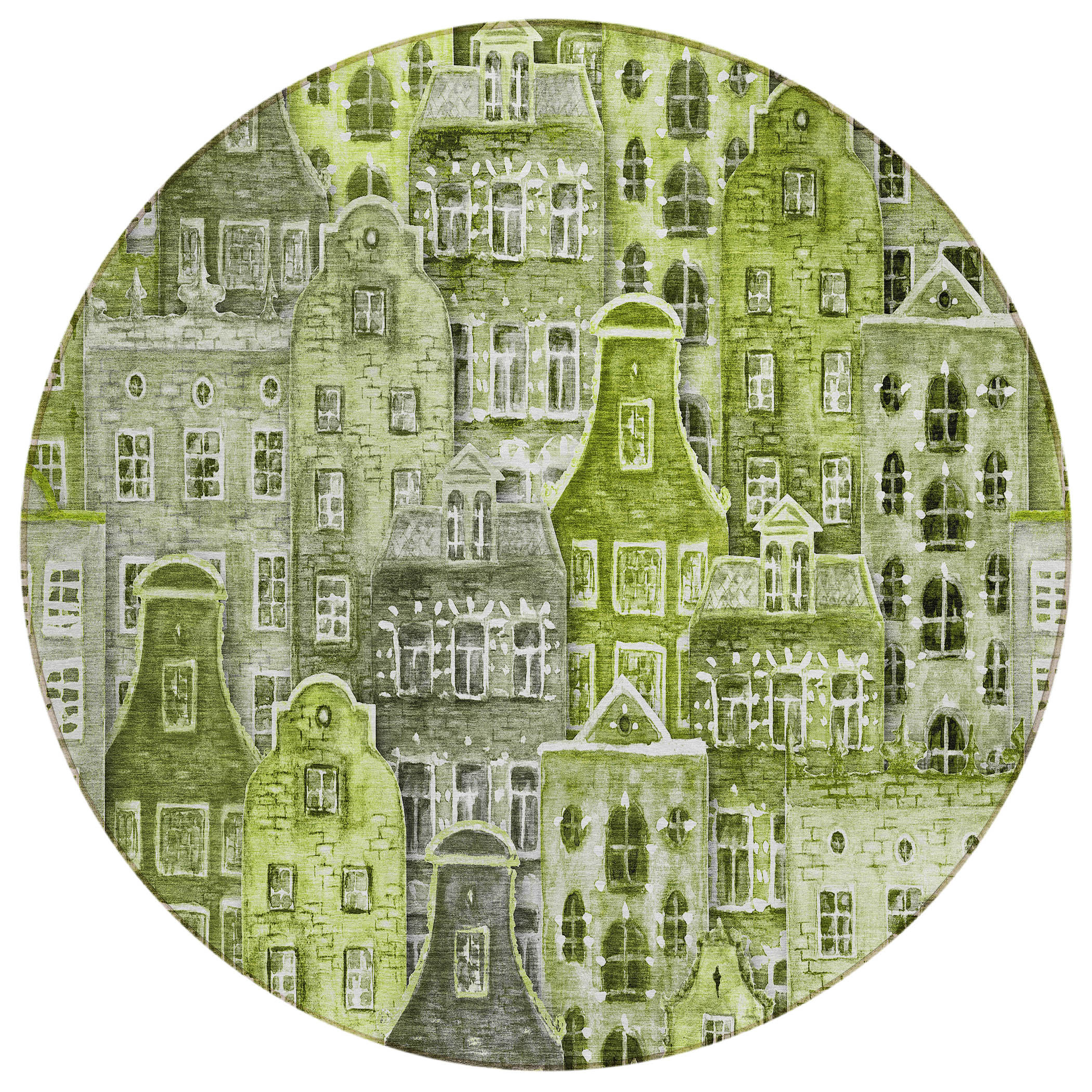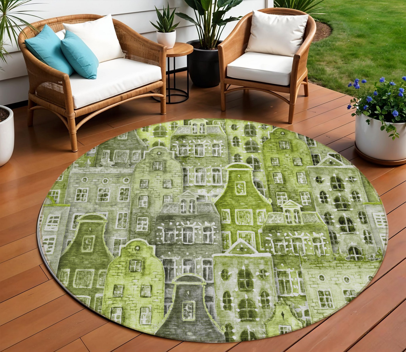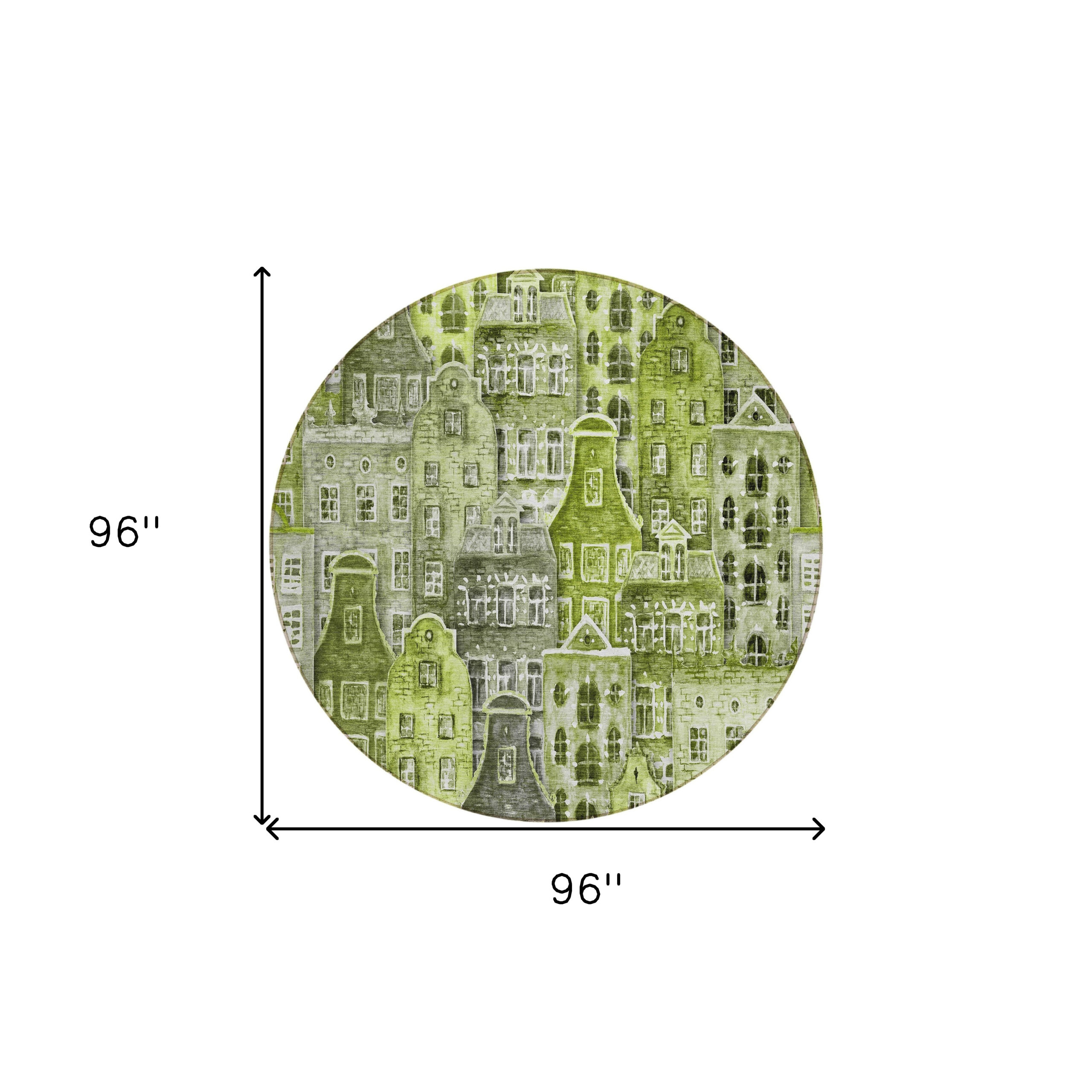 8′ Green And Lime Green Round Village Houses Washable Indoor Outdoor Area Rug