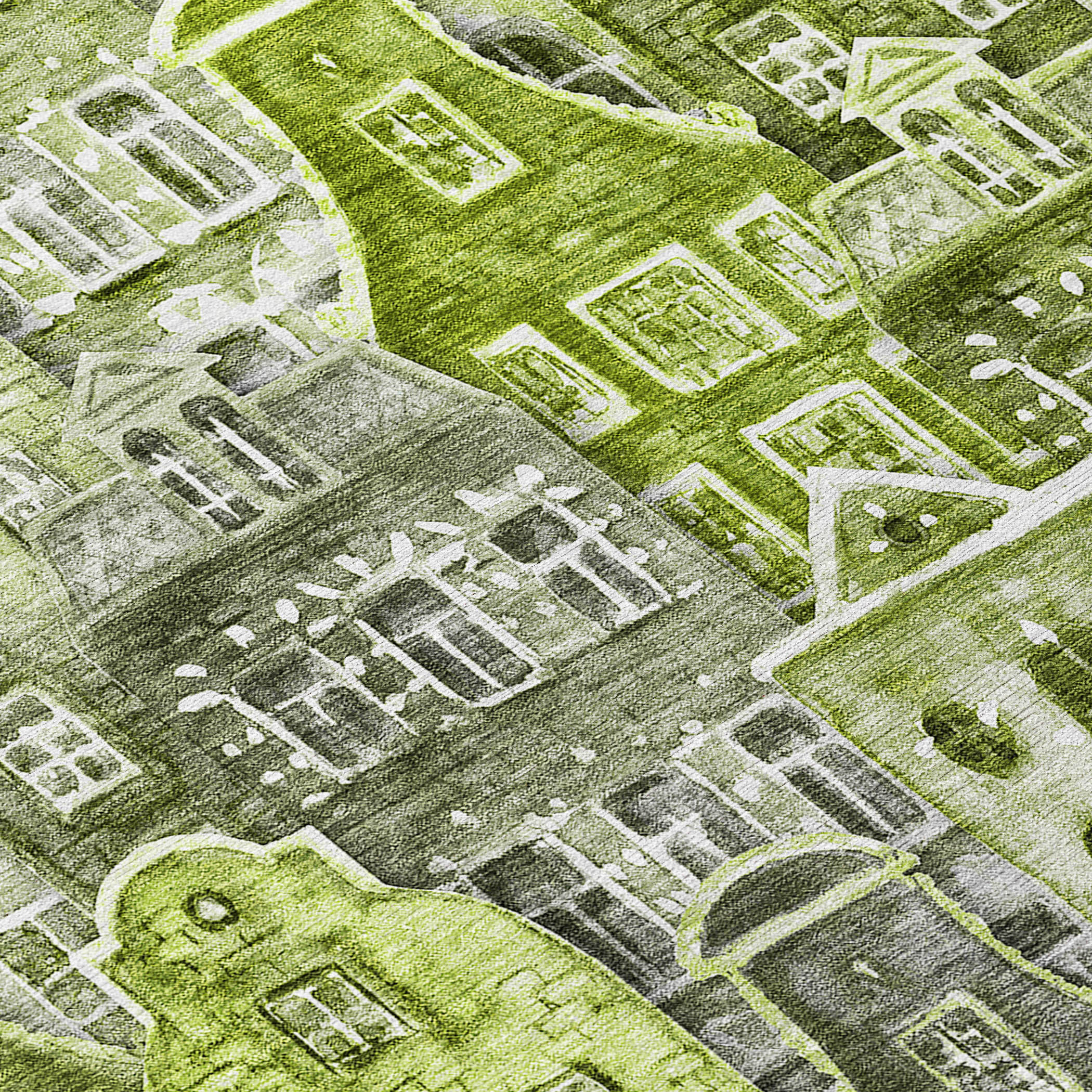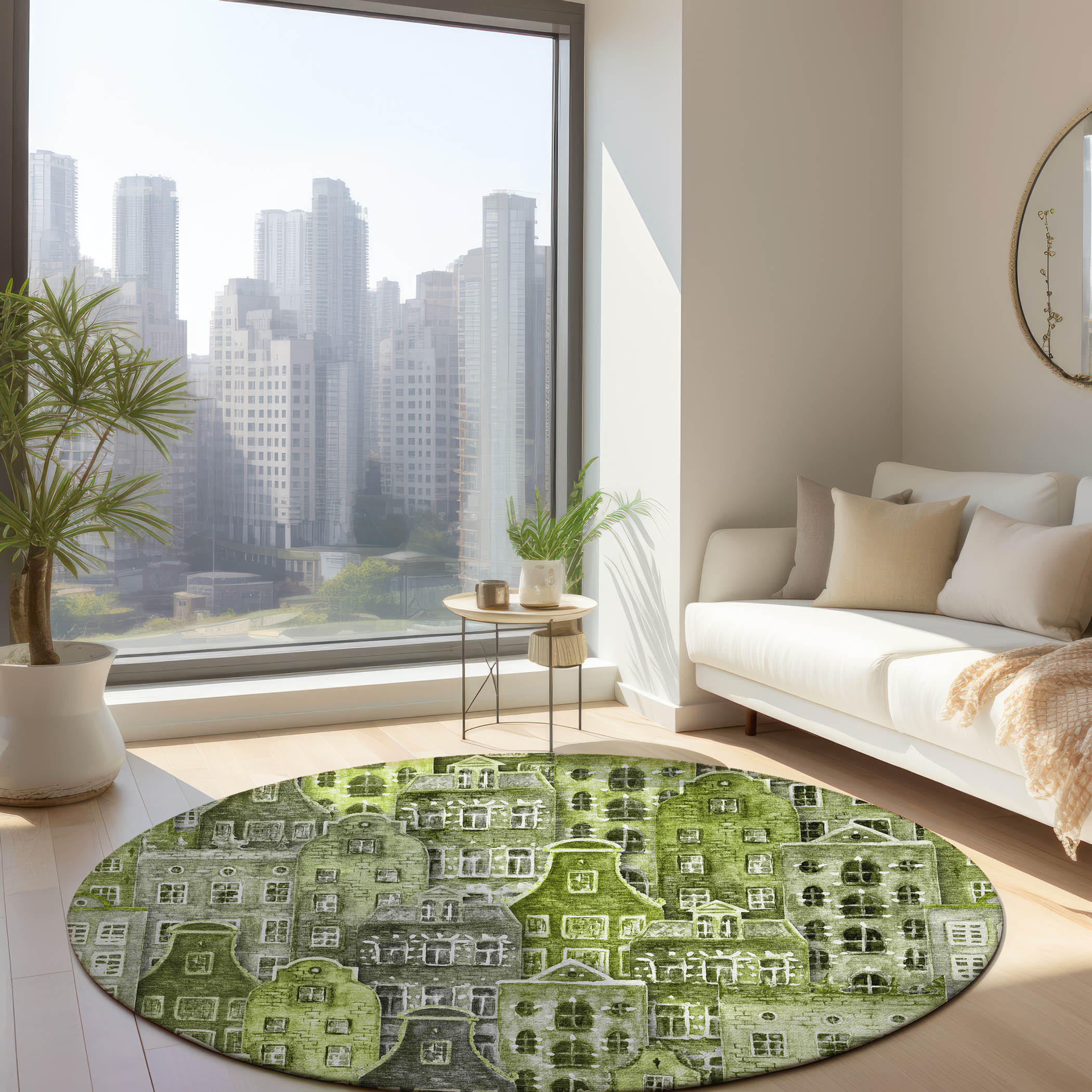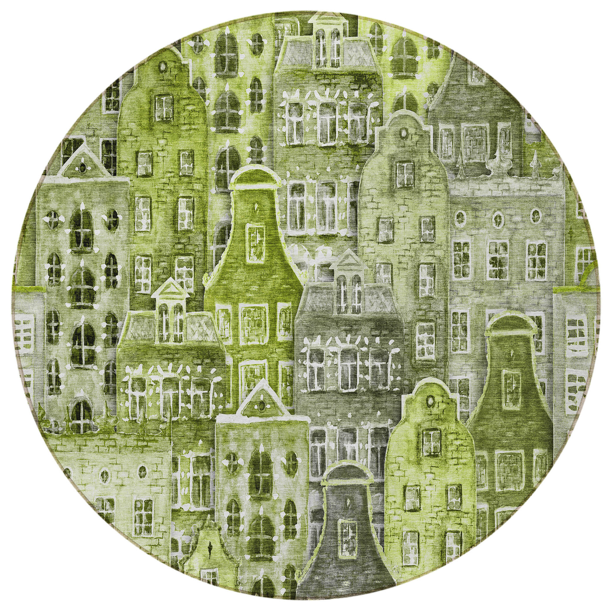 8′ Green And Lime Green Round Village Houses Washable Indoor Outdoor Area Rug