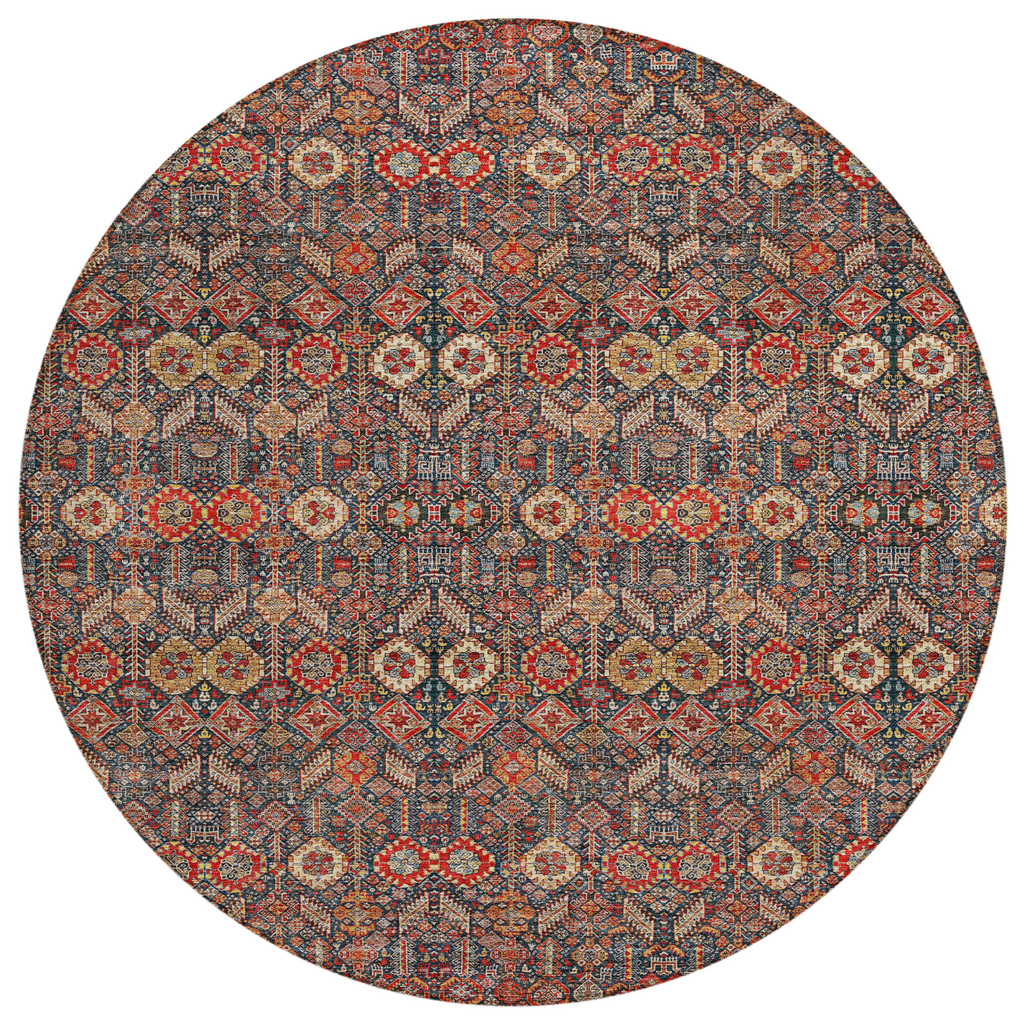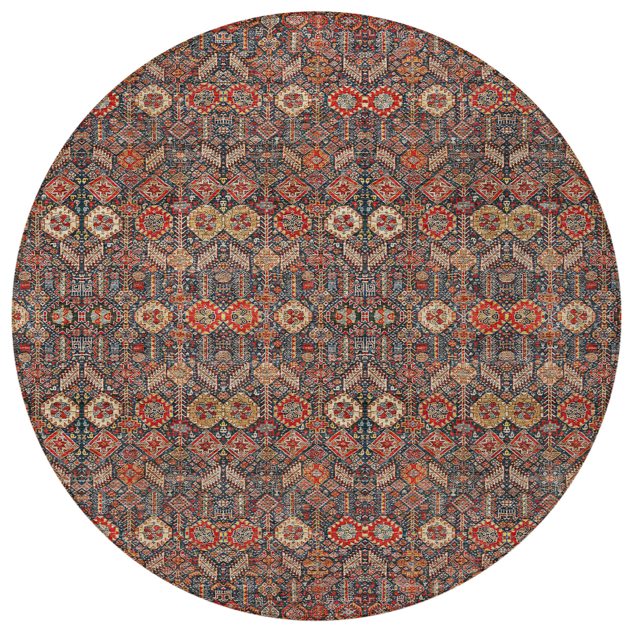 Set an inviting tone in your space with this 8-foot round red and dark blue round floral washable stain resistant non skid indoor outdoor area rug. This geometric round shaped rug features a floral pattern in red and dark blue that combines a good looking print with a unique and updated shape. The mix of shape, color, and design gives this rug refreshing visual interest. Ideal for spaces with kids and pets, this rug is stain resistant to help repel stains and spilled liquids. Area rugs help to give warmth and sense of home to your space. 96-inch H x 96-inch W x 0.19-inch D