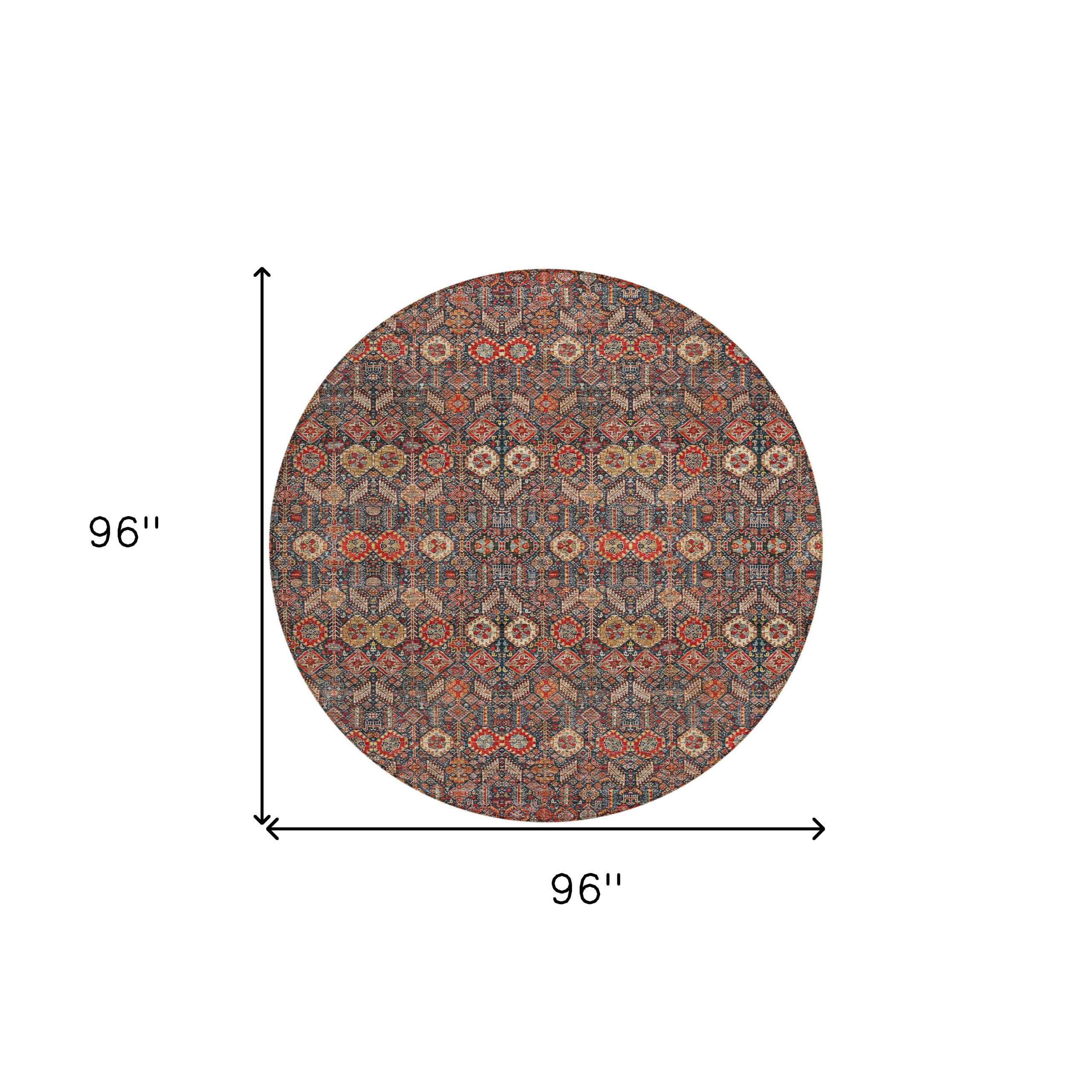 8′ Round Red and Dark Blue Round Floral Washable Non Skid Indoor Outdoor Area Rug