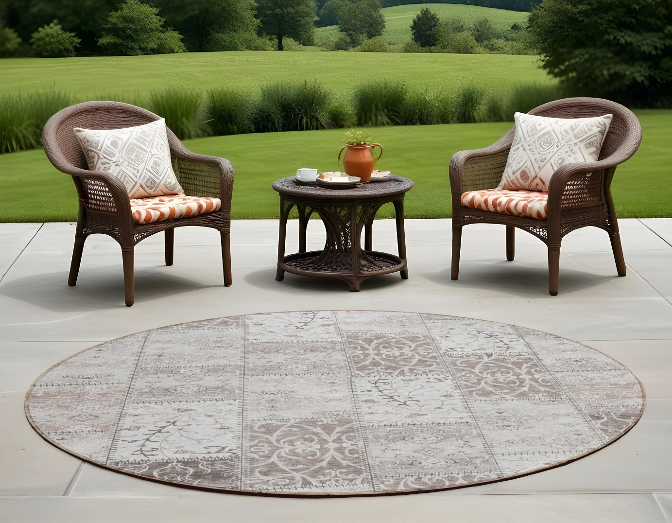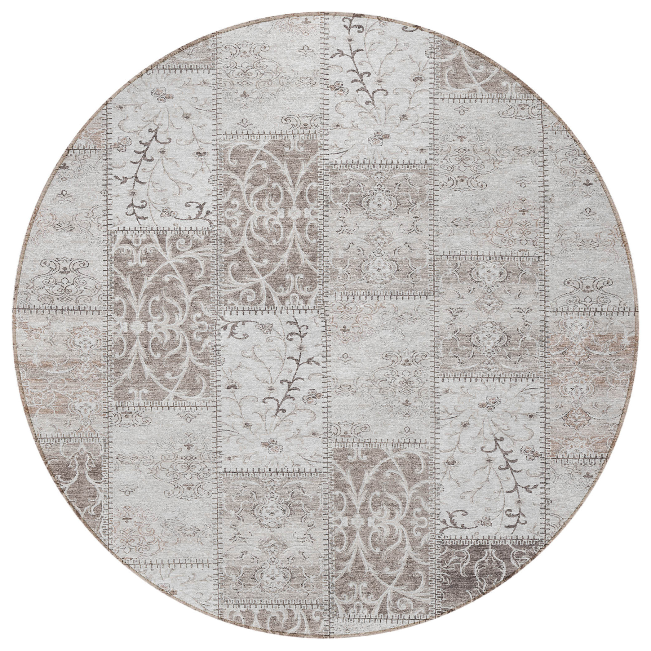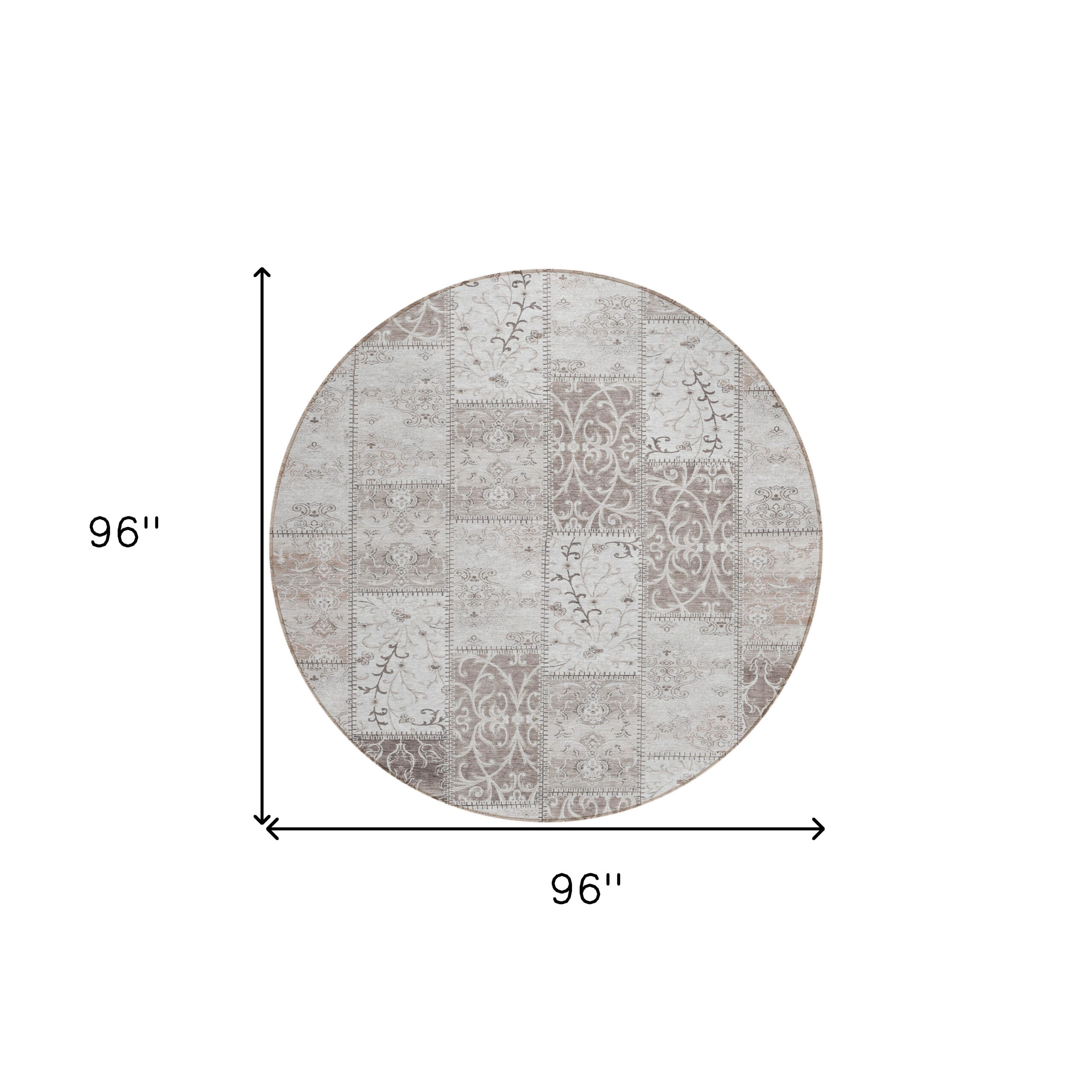 8′ Round Taupe and Ivory Round Patchwork Washable Non Skid Indoor Outdoor Area Rug