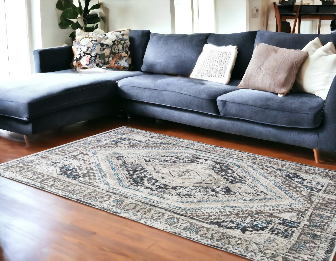 8′ x 10′ Gray Beige and Blue Geometric Distressed Area Rug With Fringe