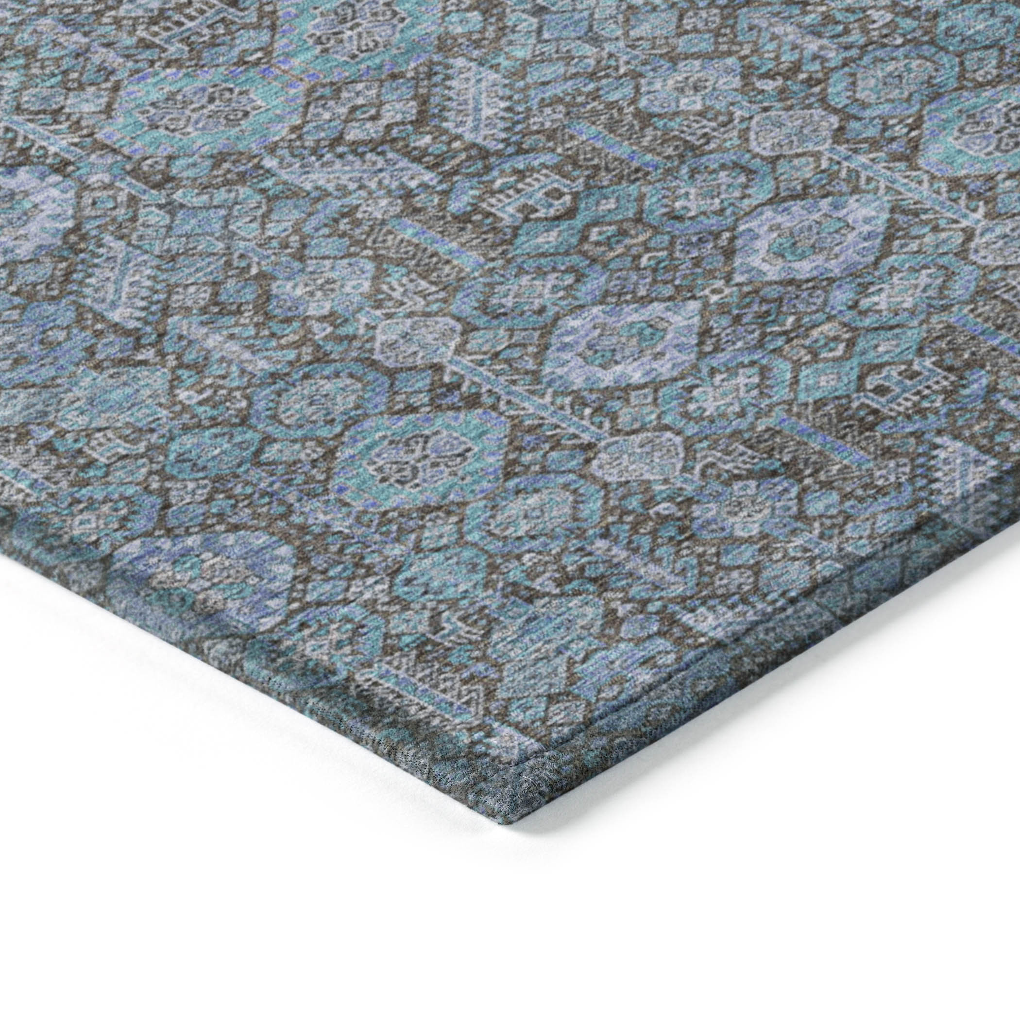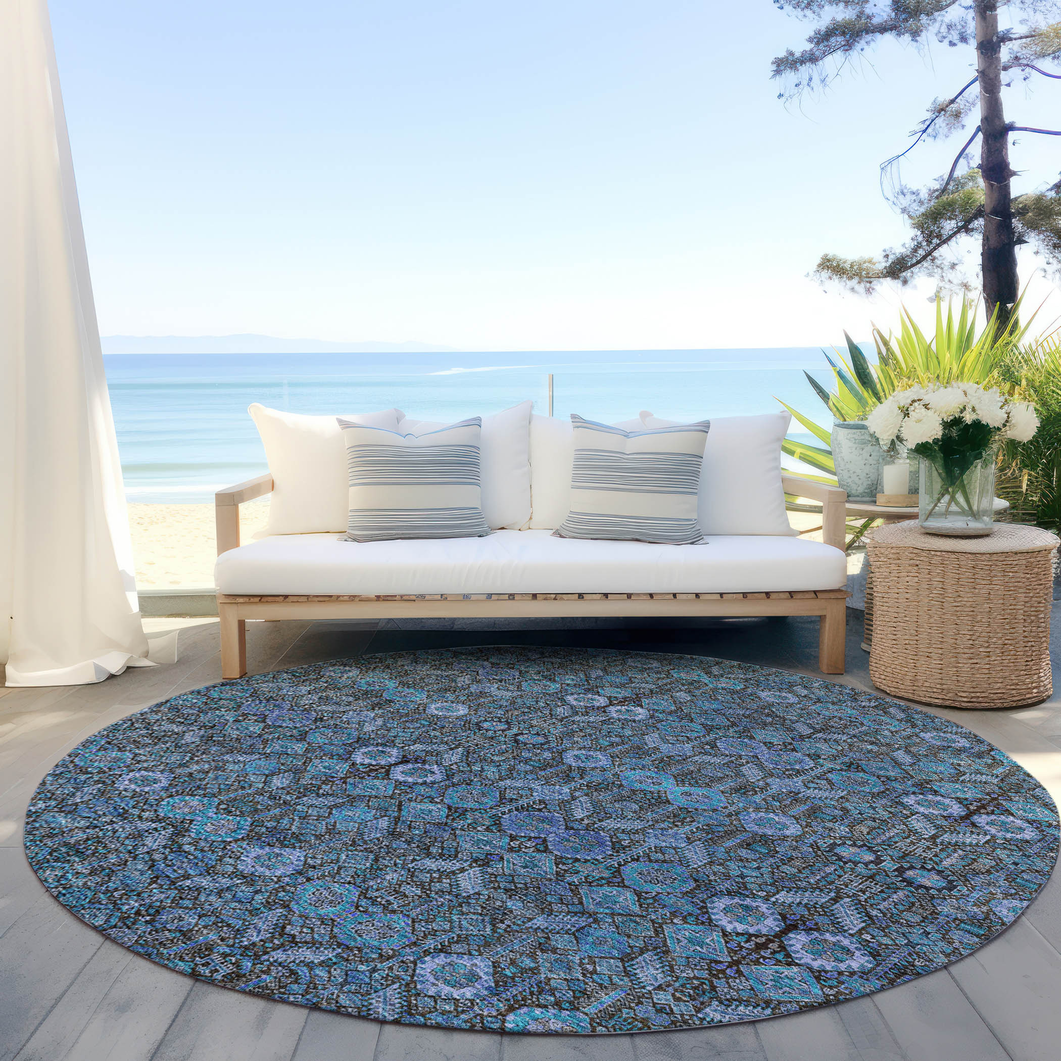Add some artistry to your room with this 8-foot x 8-foot teal round tribal washable indoor outdoor area rug. This geometric round shaped rug features a tribal pattern in teal that combines a good looking print with a unique and updated shape. The mix of shape, color, and design gives this rug refreshing visual interest. Ideal for spaces with kids and pets, this rug is stain resistant to help repel stains and spilled liquids. Place this area rug against a hardwood or tile floor and it will enliven your living space with style and sophistication. 96-inch H x 96-inch W x 0.19-inch D
