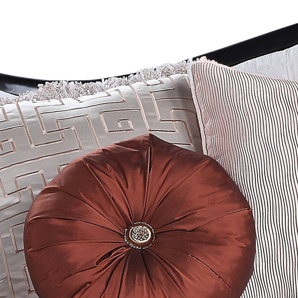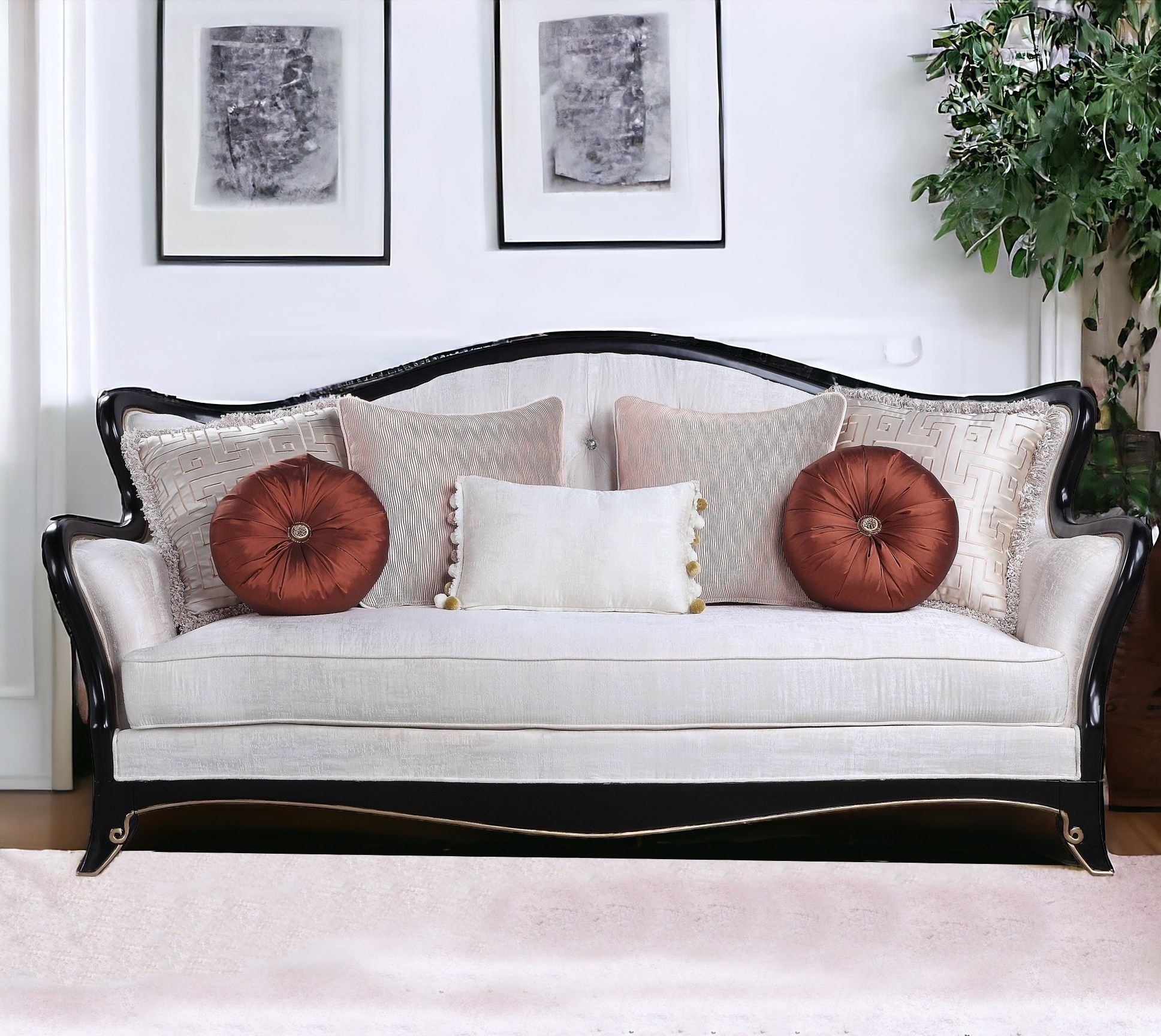 86″ Beige And Black Sofa With Seven Toss Pillows