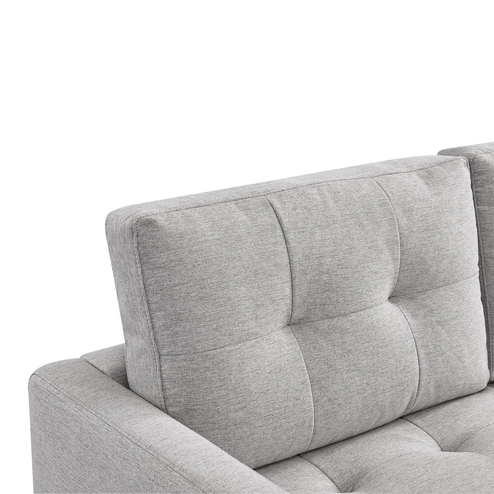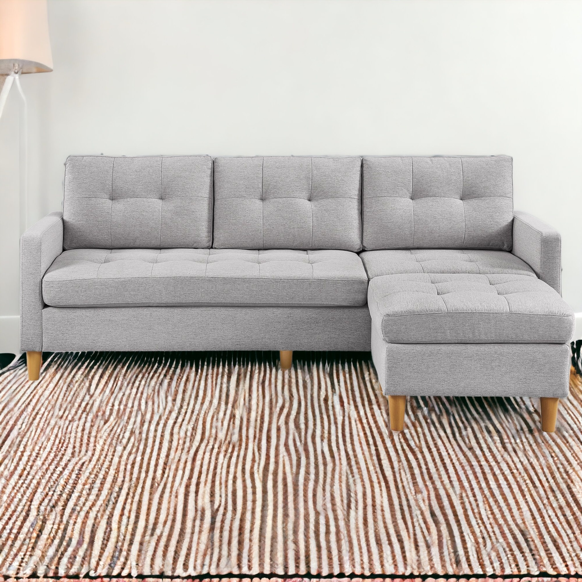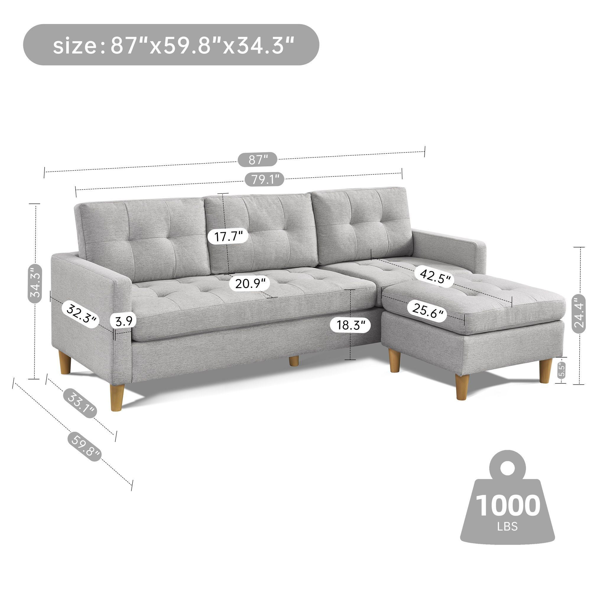 Designed for comfort and good looks, this 87-inch light gray polyester blend and natural sofa with ottoman is a great option to anchor your space. Built to last, this solid color standard is upholstered with polyester blend that is designed to be soft, resilient, easy to maintain, and stand the test of time. Pocket spring construction gives this piece strong support and makes it comfortable to sit even for long periods of time. Removable back cushions make this sofa easy to manage. Comes complete with a coordinating ottoman to rest your feet, create a chaise lounge effect, or use for additional seating. Squared arms offer a comfy place to rest. The tufted stitching pattern adds visual interest and fine designer detailing. Natural solid wood legs effortlessly elevate the room and add a touch of contemporary design. 34-inch H x 87-inch W x 60-inch D