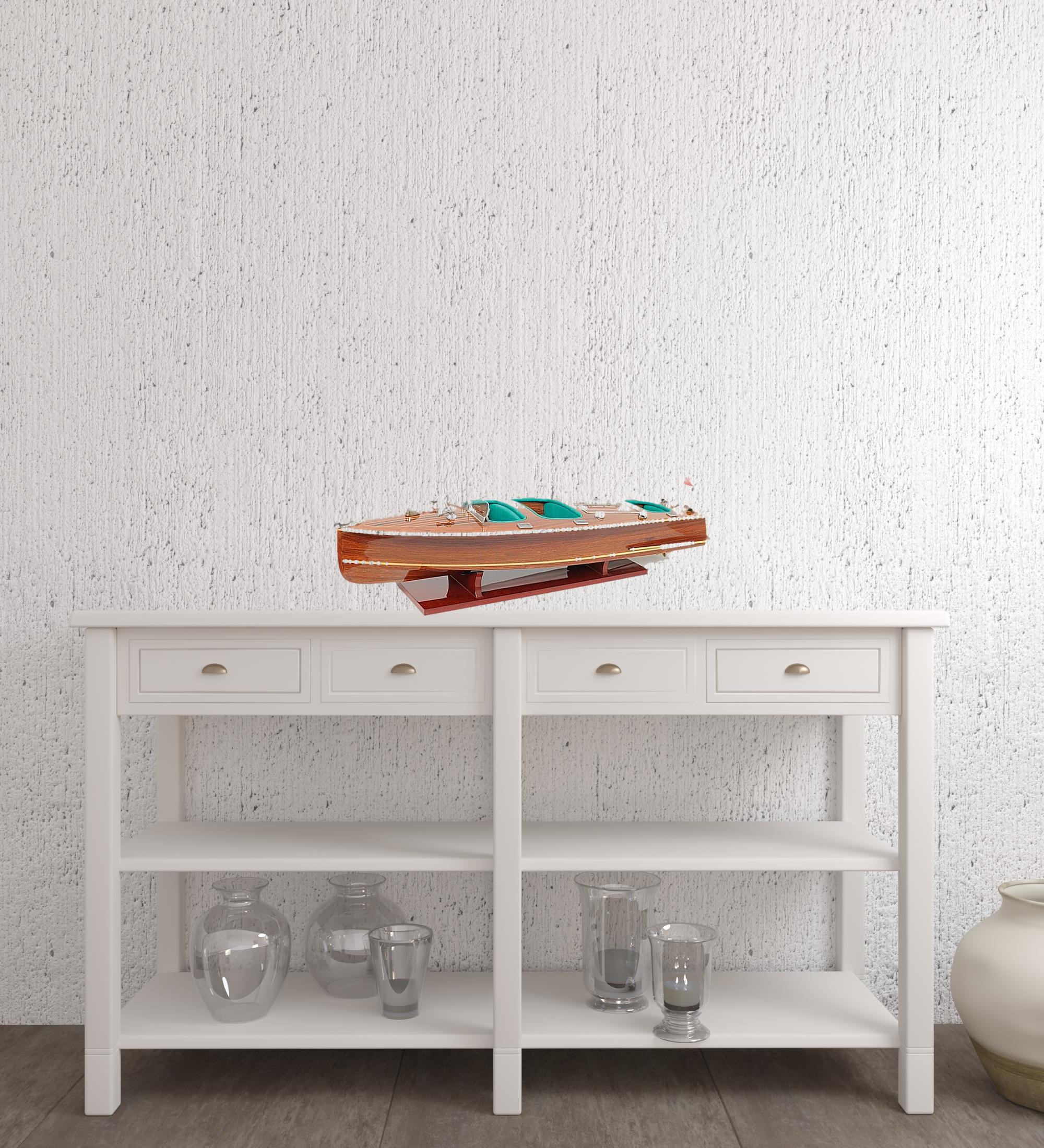 Unique and decorative, this 9″ wooden c1928 chris craft triple cockpit large boat hand painted decorative boat will leave a lasting impression. This wooden colored piece is made from high grade manufactured wood. A perfect decorative addition for anyone who loves a stylish look and feel. Use this piece as bookshelf decor, on your desk, coffee table, or anywhere in your home. 8.5″ H x 32″ W x 9″ D