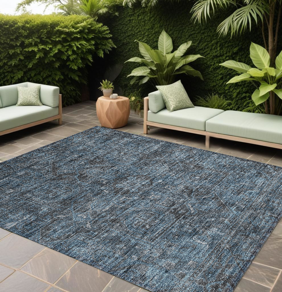 9' X 12' Navy and Black Oriental Washable Non Skid Indoor Outdoor Area Rug