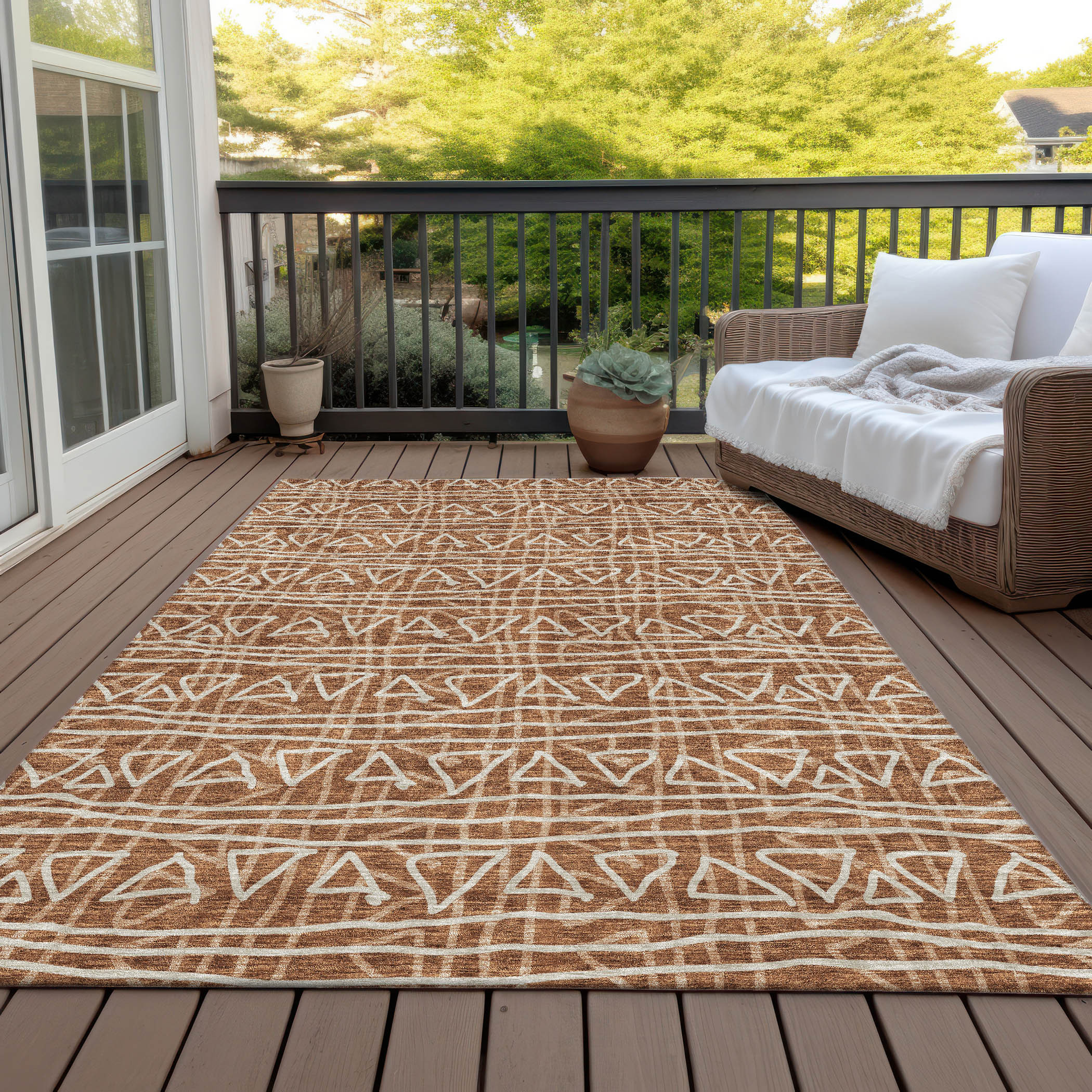 This 9-foot x 12-foot terra cotta copper and beige geometric washable indoor outdoor area rug, is a great way to add warmth to a room. This rectangle shaped rug features a geometric design that will work well both indoors or out. A classic shape marries with good looking design for your living room, hall, bedroom, porch, patio, or poolside. Ideal for outdoor spaces or high traffic areas with kids and pets, this rug is made from heavy duty polyester that is stain resistant to help repel water, dirt, and stains. Makes a great way to dress up your patio, porch, or poolside, but also works well as a durable and easy to maintain option in the kitchen, family room, or mudroom. 108-inch h x 144-inch w x 0.19-inch d.