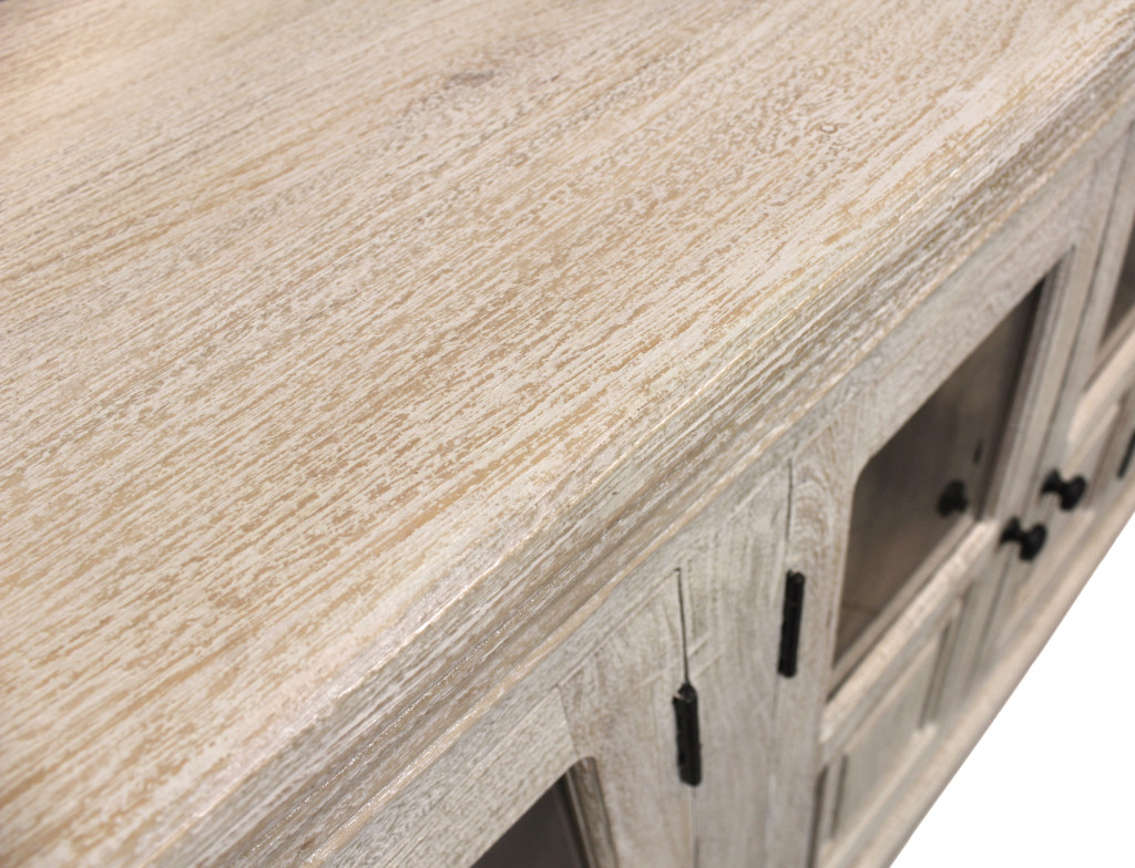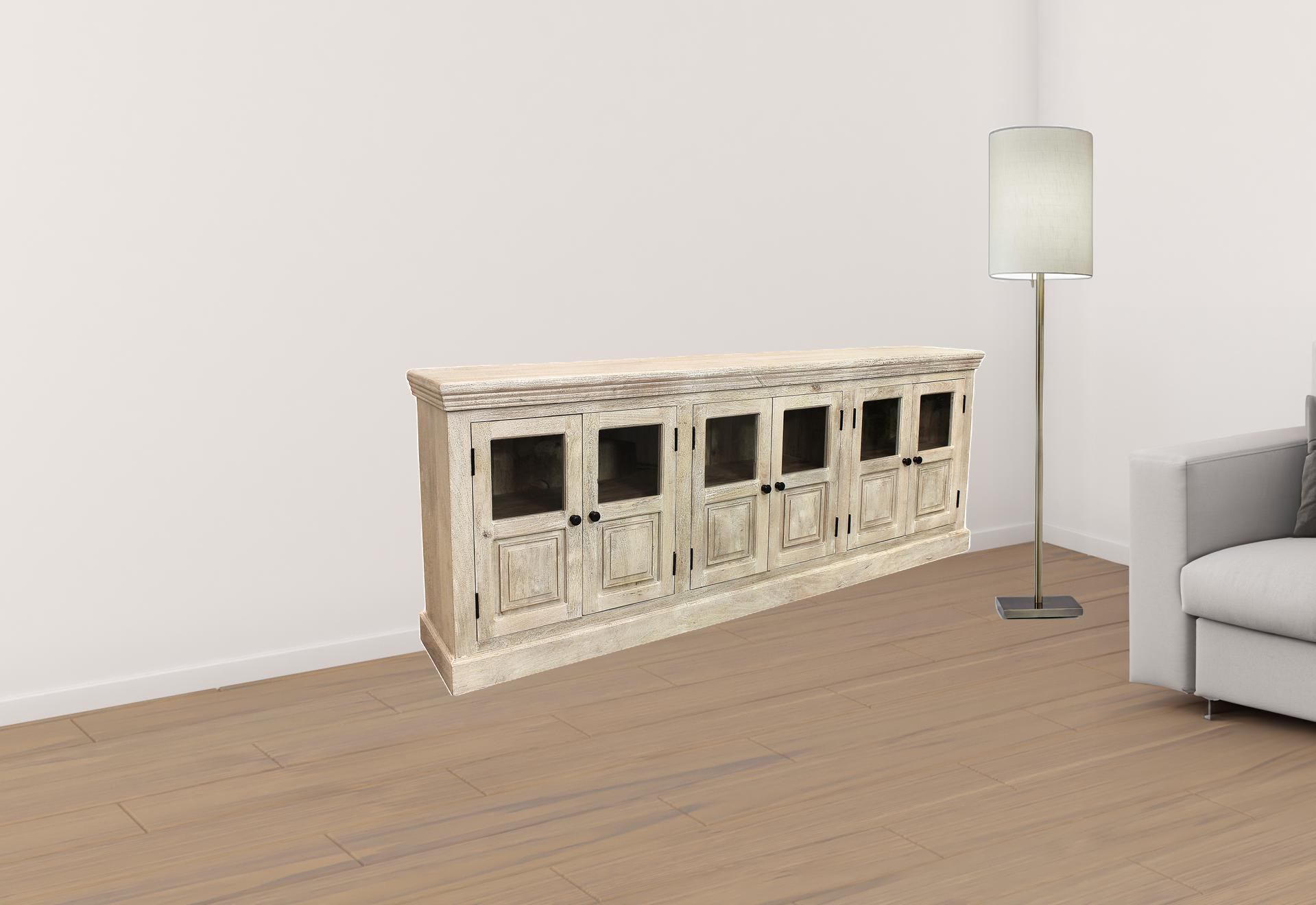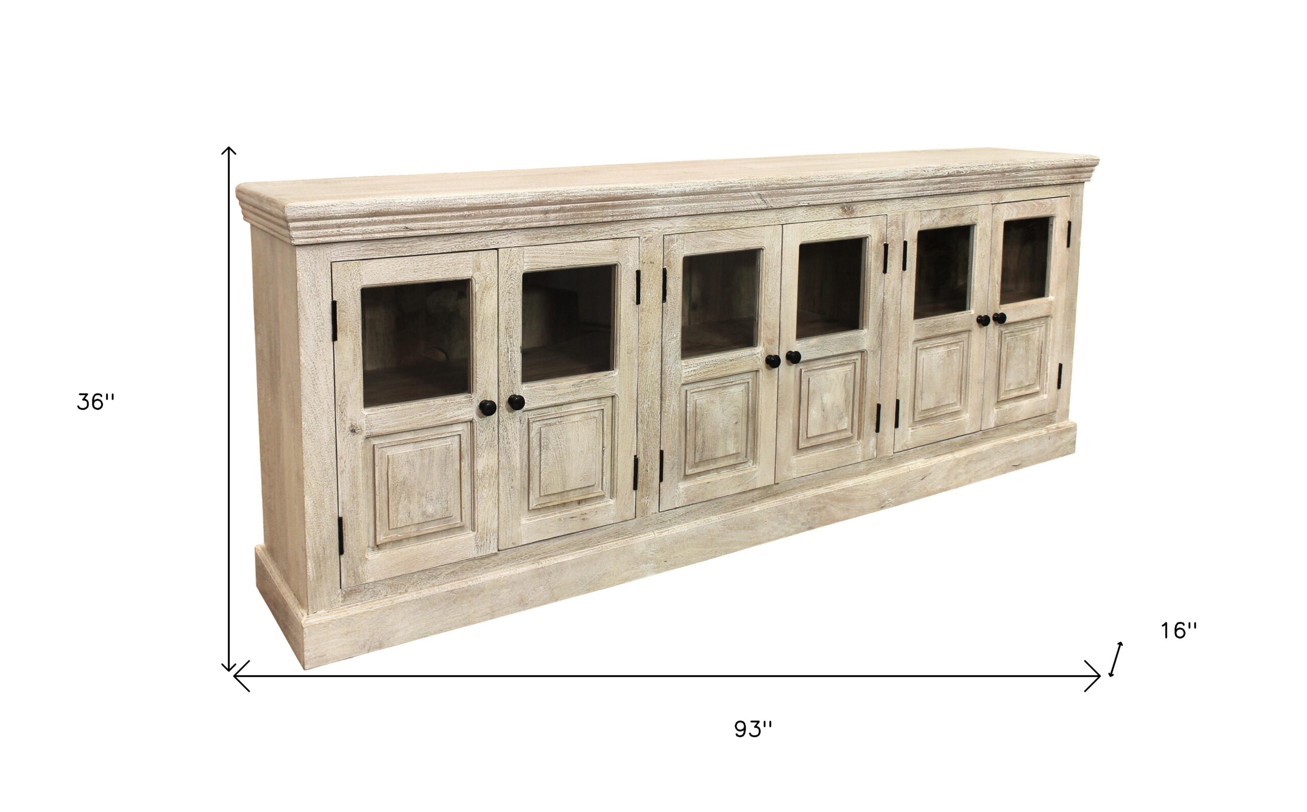 93″ White Solid Wood Distressed Sideboard with Six Glass Doors
