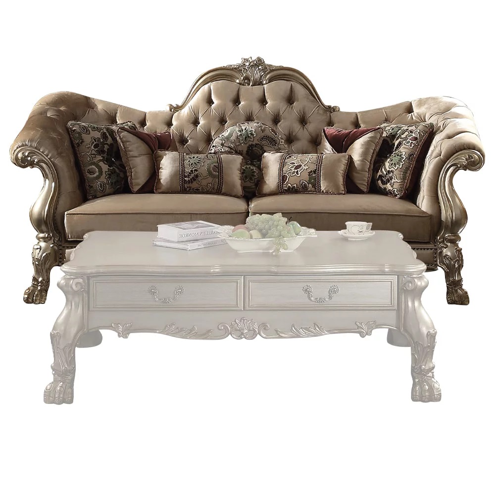96″ Bone Polyurethane, Velvet And Gold Sofa With Seven Toss Pillows